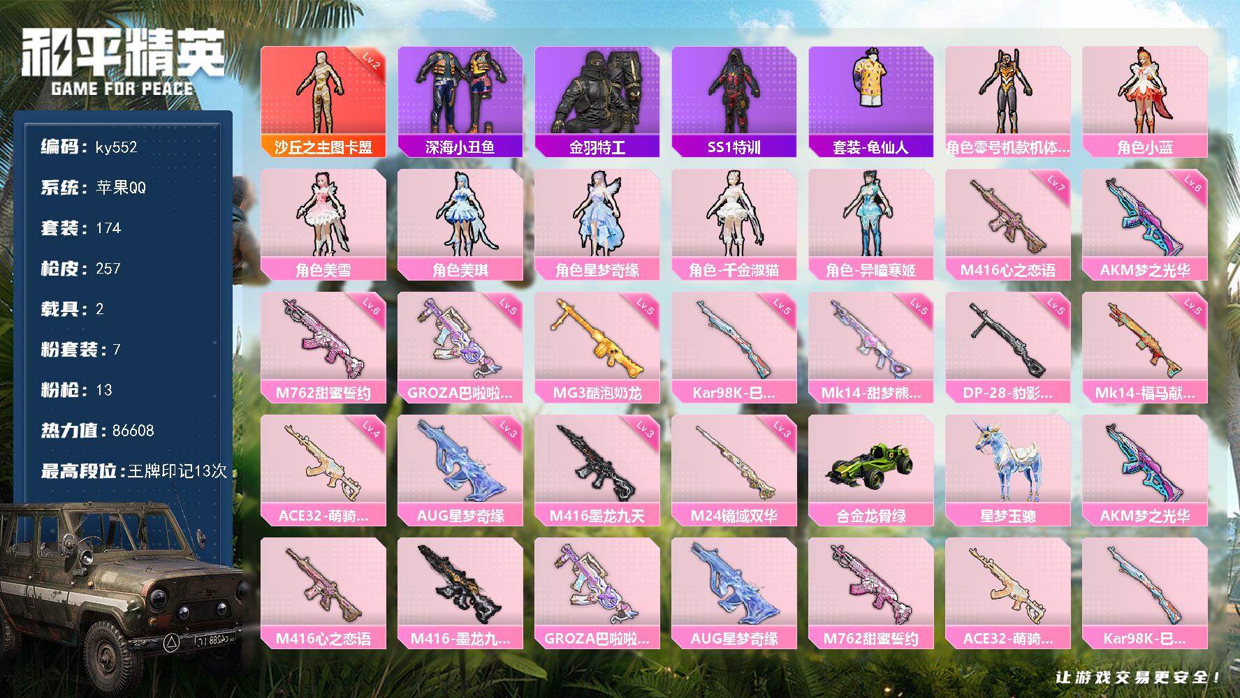 [17229030]苹果 手Q-1神装-7粉装-13特效枪-2载具-10粉色飞行器-86608热力值-13王牌印记-174套装-257枪皮