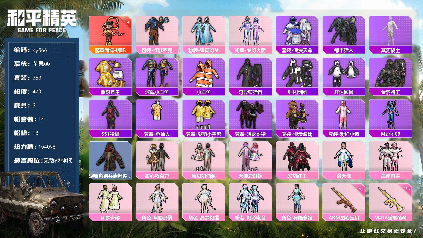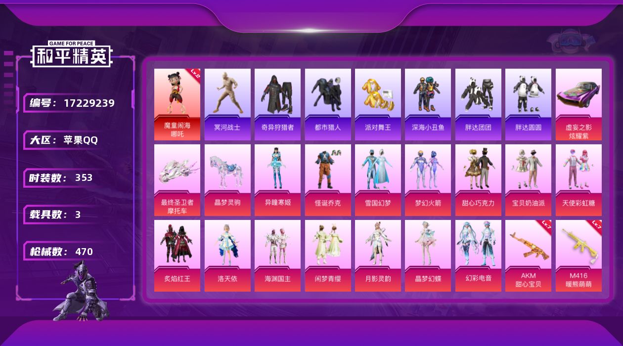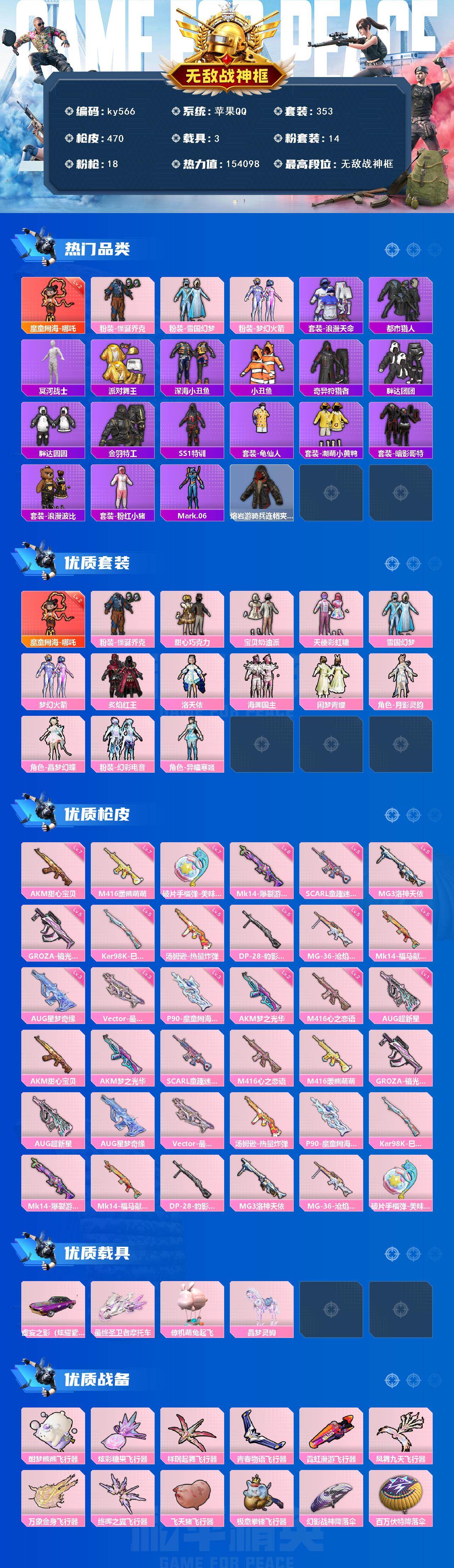 [17229239]苹果 手Q-无敌战神框-1神装-14粉装-18特效枪-3载具-10粉色飞行器-154098热力值-25王牌印记-353套装-470枪皮