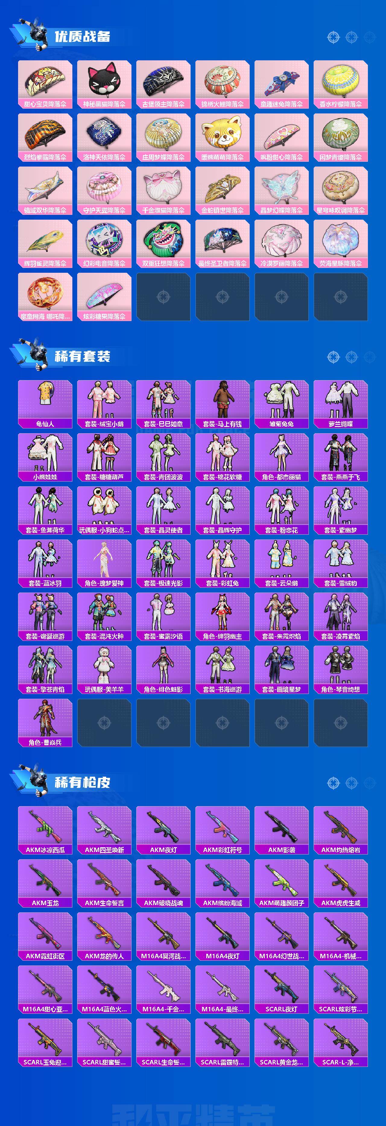 AKM-甜心宝贝,AKM-梦之光华,SCAR-L-童趣迷兔,M416-心之恋语,M416-暖熊萌萌,GROZA-镜光银凌,AUG-超新星,AUG-星梦奇缘,Kar98K-巳巳如意,MG3-洛神天依