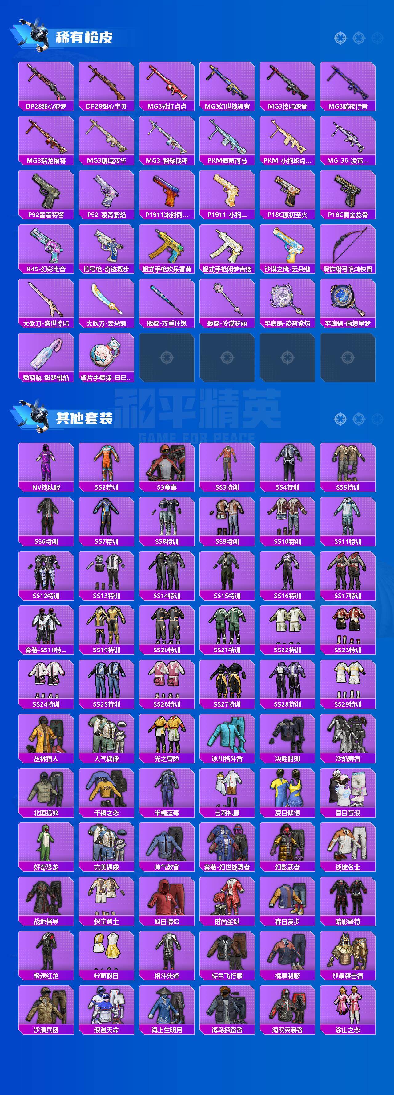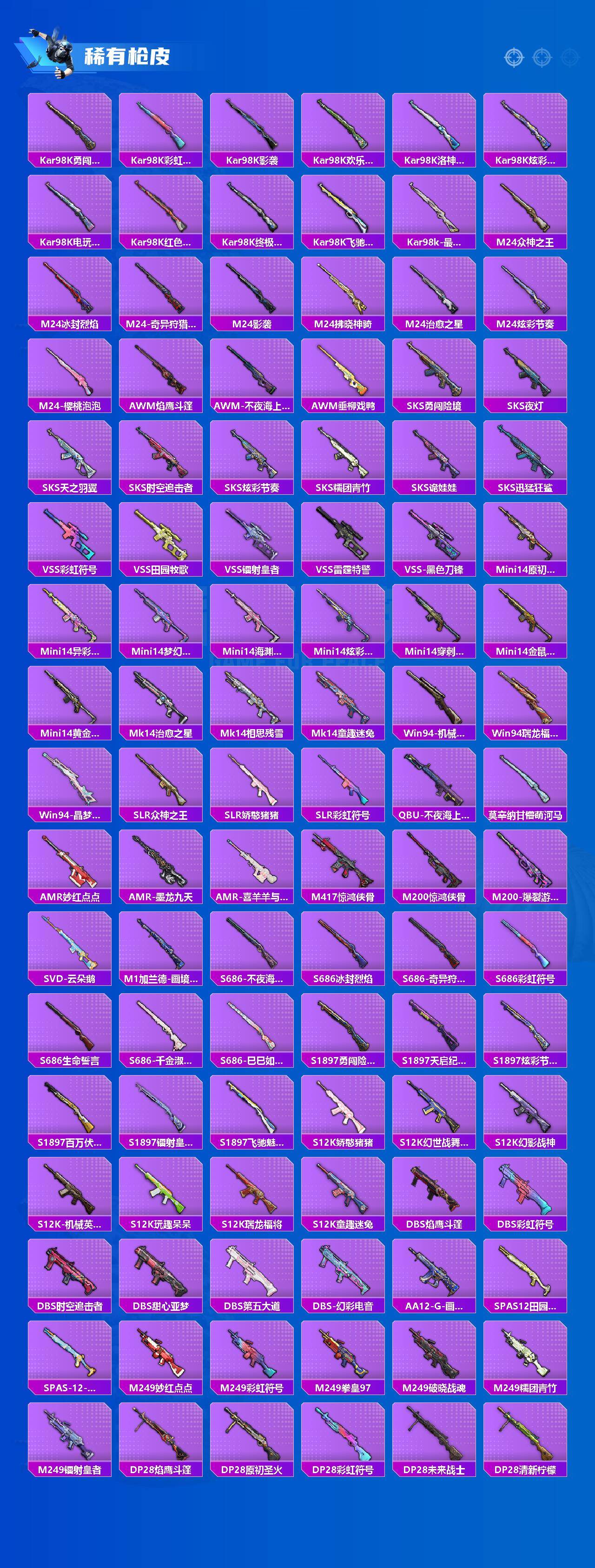 【粉色枪皮】:AKM-甜心宝贝,AKM-梦之光华,SCAR-L-童趣迷兔,M416-心之恋语,M416-暖熊萌萌,GROZA-镜光银凌,AUG-超新星,AUG-星梦奇缘,Vector-最终圣卫者,汤姆逊-热量炸弹,P90-魔童闹海 敖丙,Kar98K-巳巳如意,Mk14-爆裂游戏,Mk14-福马献瑞,DP-28-豹影疾电,MG3-洛神天依,MG-36-沧焰双生,破片手榴弹-美味星星糖