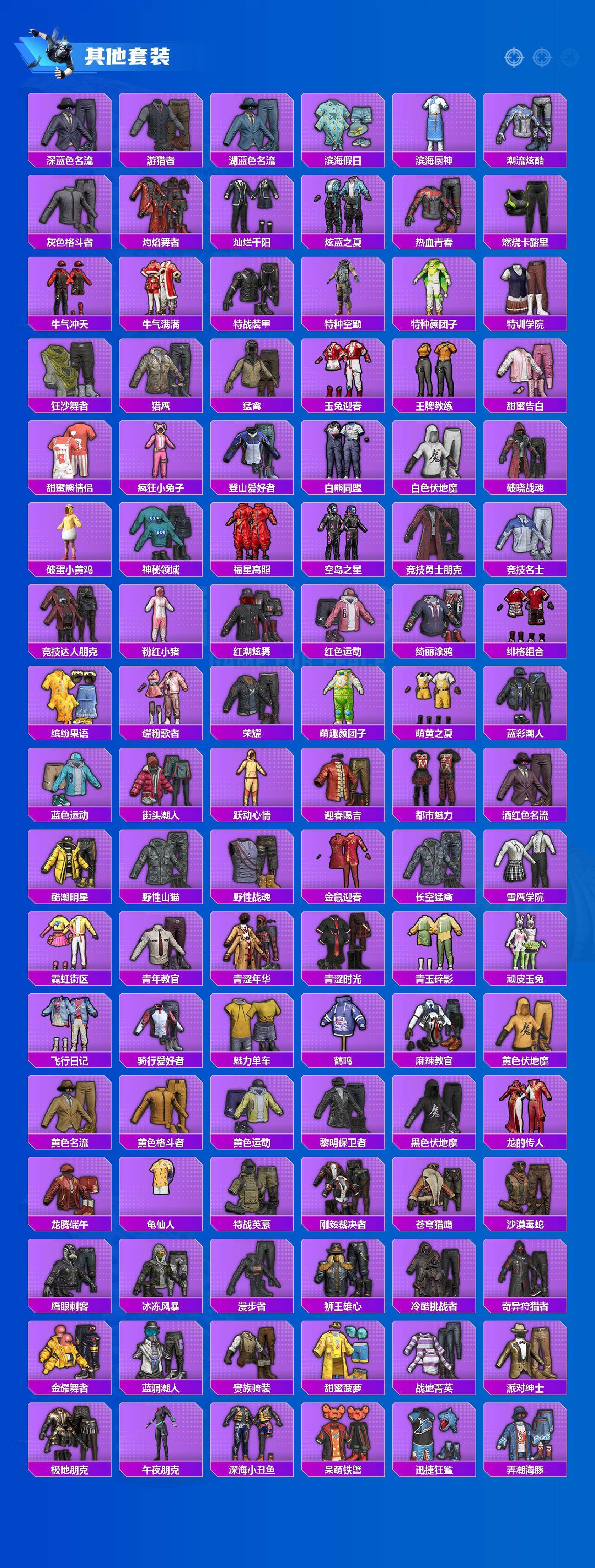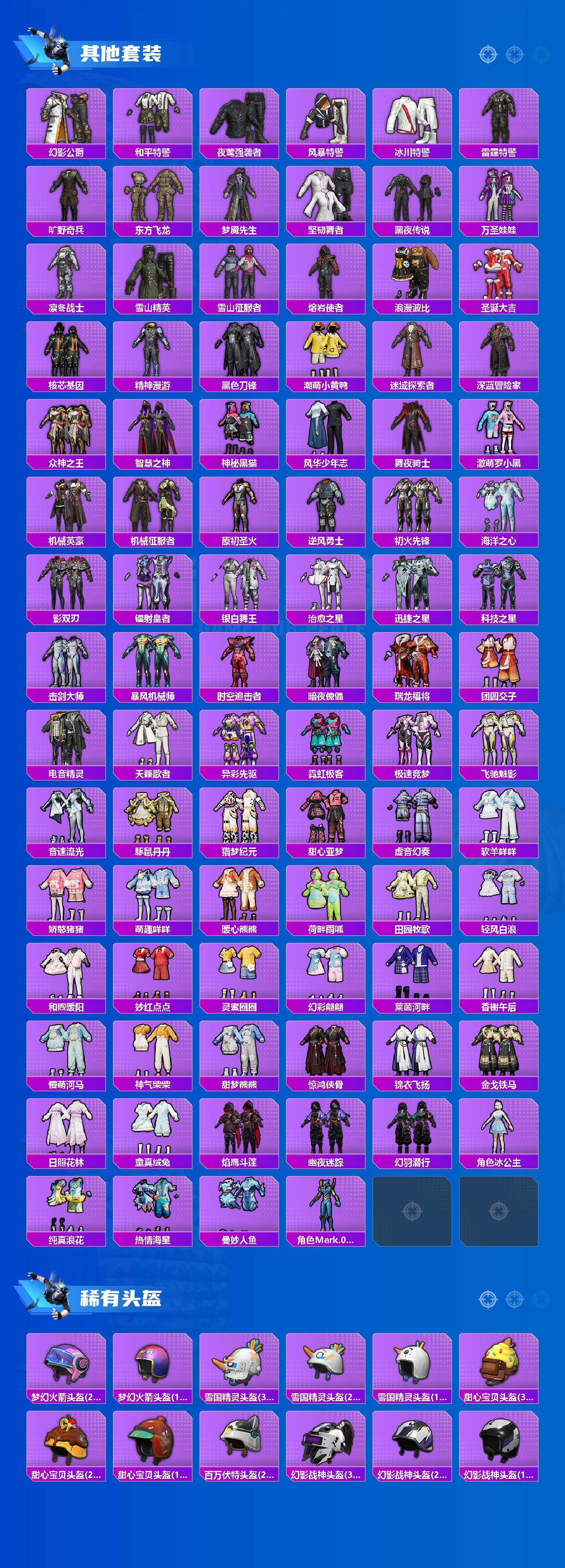 套装-怪诞乔克,套装-雪国幻梦,套装-梦幻火箭,套装-都市猎人,套装-冥河战士,套装-派对舞王,套装-深海小丑鱼,套装-奇异狩猎者,套装-胖达团团,套装-胖达圆圆,套装-潮萌小黄鸭,套装-浪漫波比,套装-宝贝奶油派,套装-天使彩虹糖,套装-炙焰红王,角色-洛天依,套装-海渊国主,套装-闲梦青缨,角色-月影灵韵,好奇恐龙套装,套装-鹰眼刺客,套装-狮王雄心,套装-呆萌铁蟹,套装-迅捷狂鲨,套装-东方飞龙,套装-梦魇先生,套装-万圣娃娃,套装-神秘黑猫