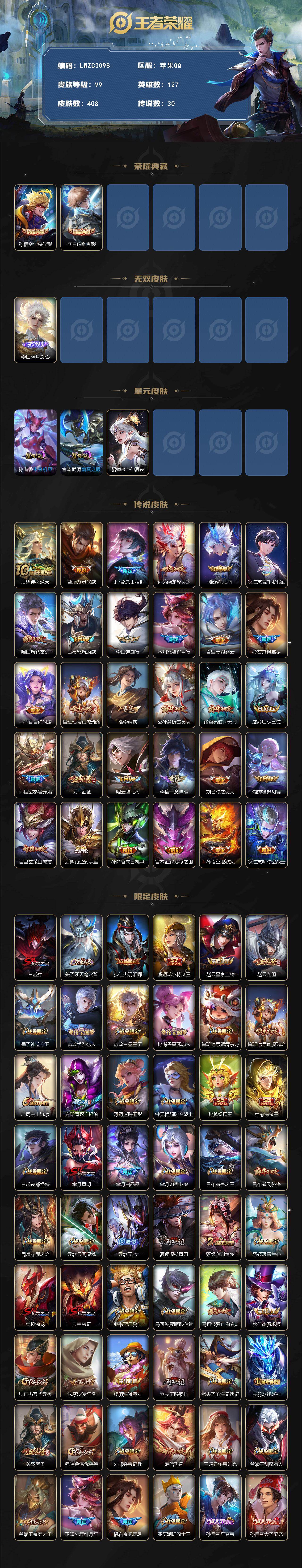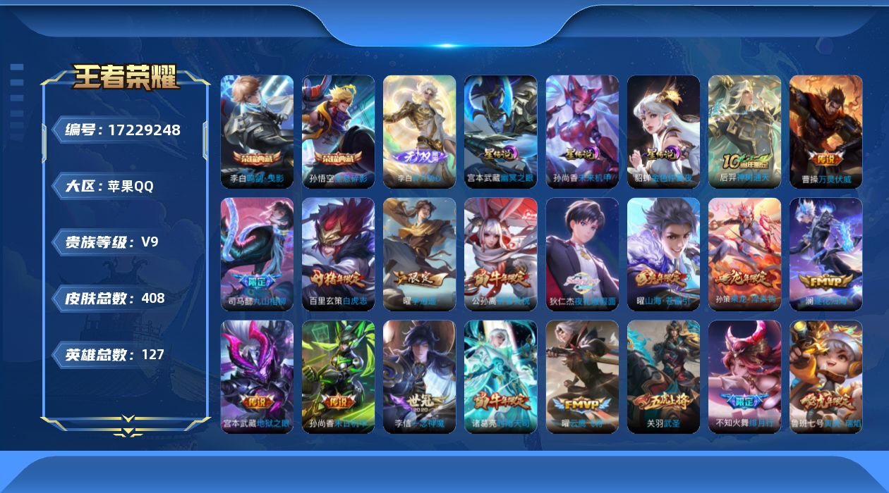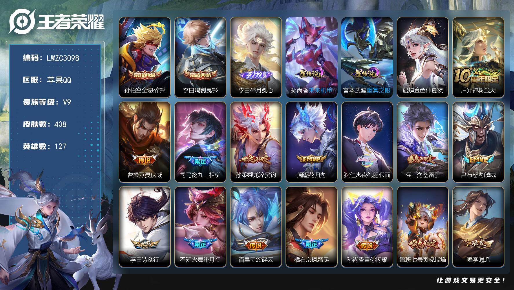 [17229248]【特价急出/详情看图】苹果Q-V9-至尊星耀V段位-127英雄-408皮肤-2典藏皮肤-1无双-3星元-30传说-123史诗