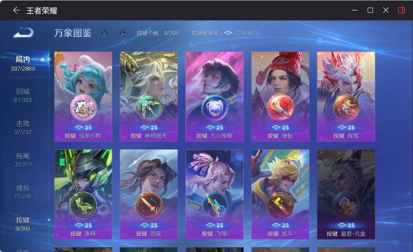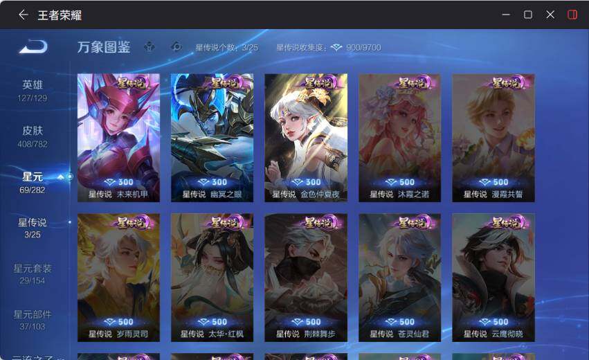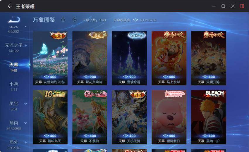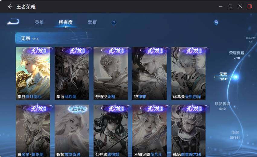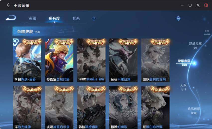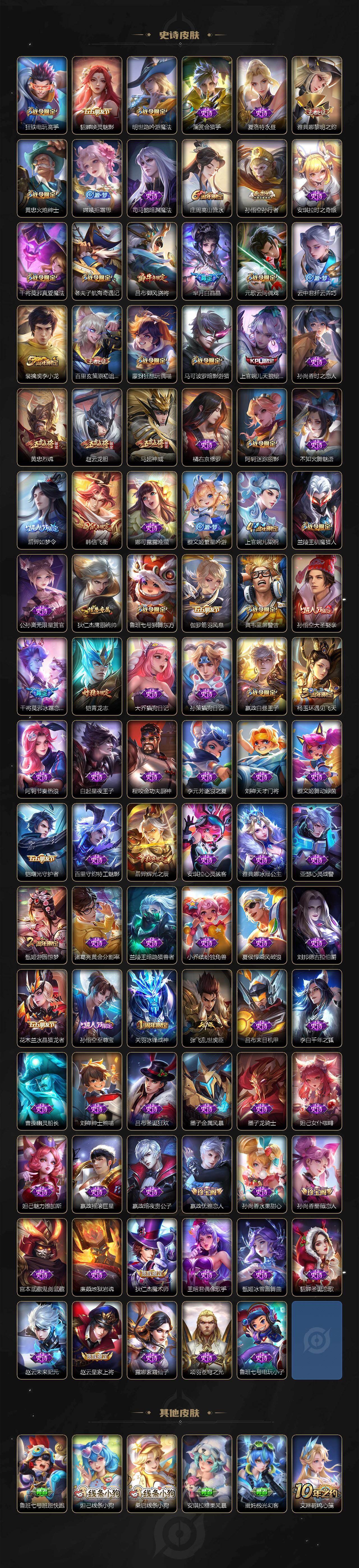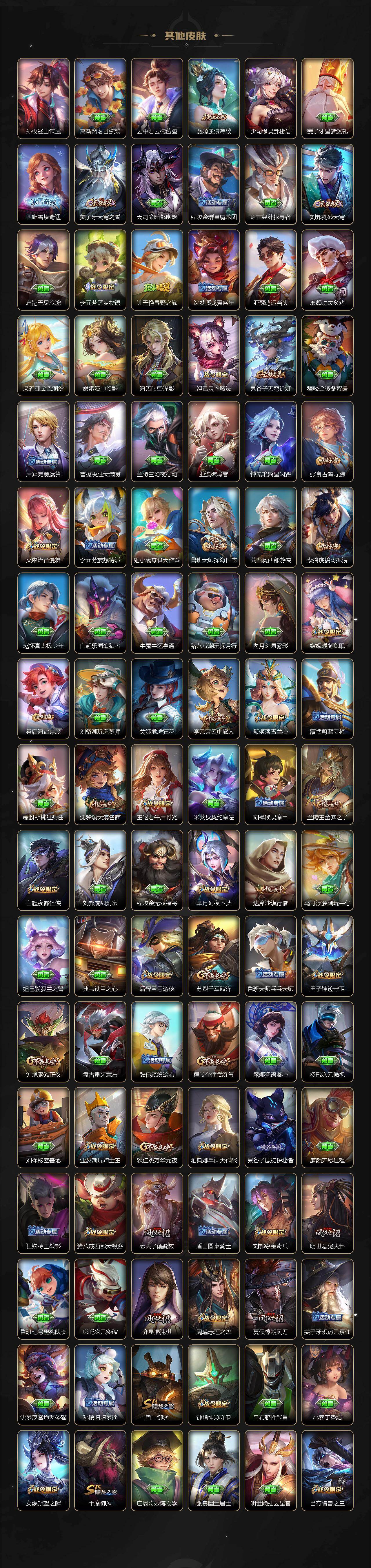 关羽冰锋战神,裴擒虎李小龙,上官婉儿梁祝,公孙离祈雪灵祝,吕布御风骁将,诸葛亮时雨天司,赵云龙胆,关羽武圣,黄忠烈魂,马超神威,后羿辉光之辰,韩信飞衡,上官婉儿天狼绘梦者,铠青龙志,百里玄策白虎志,孙悟空大圣娶亲,后羿如梦令,孙悟空至尊宝,干将莫邪冰霜恋舞曲,芈月白晶晶,孙悟空孙行者,鲁班七号寅虎·瑞焰,橘右京枫霜尽,不知火舞绯月行,李白诗剑行,马可波罗山海·玄木吟,瑶山海·碧波行