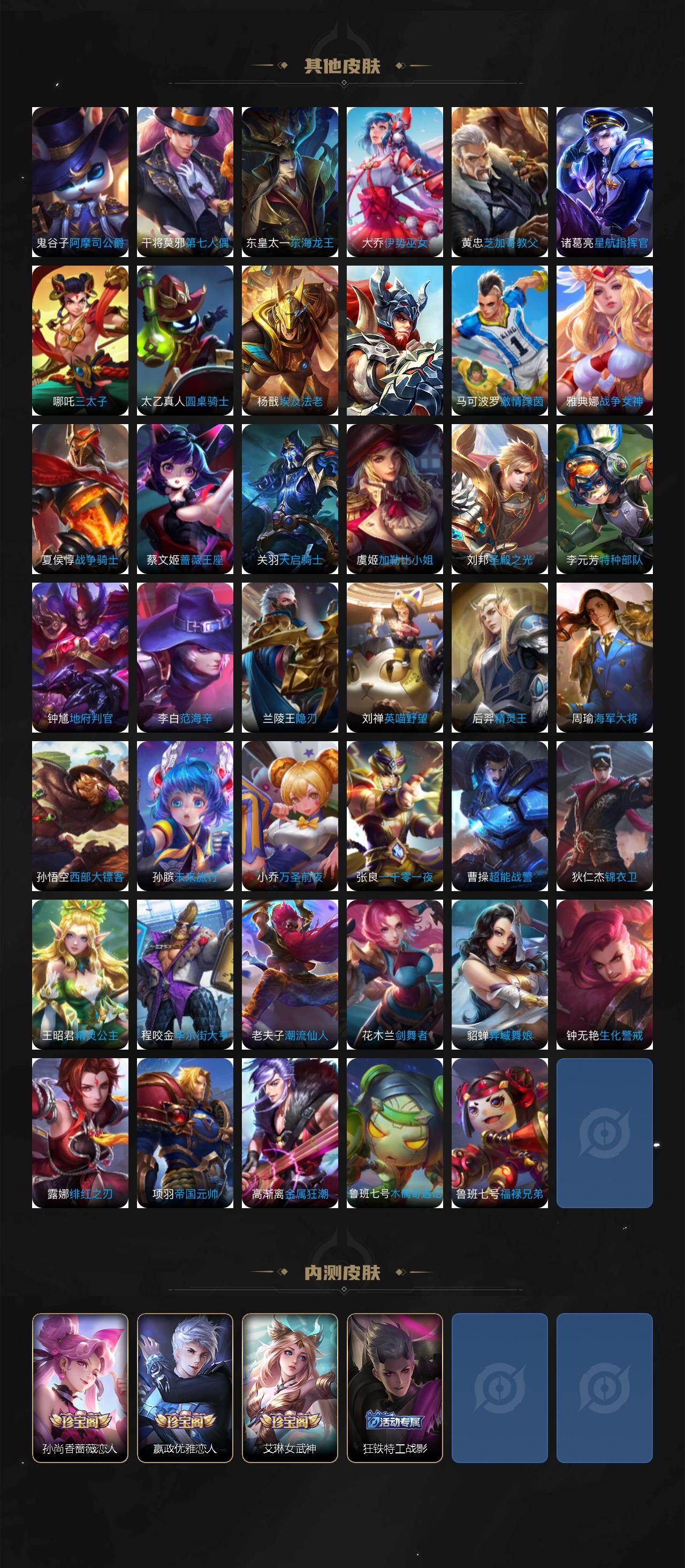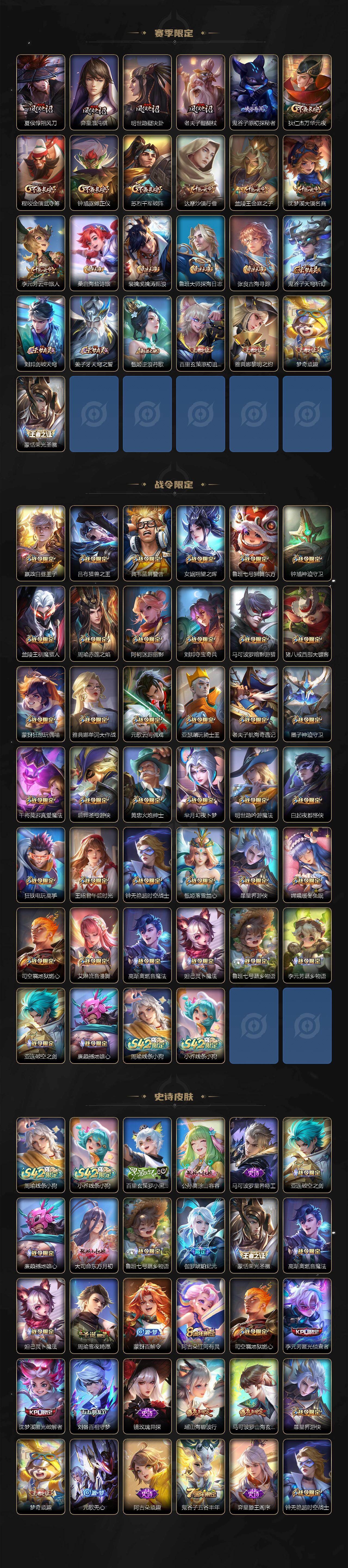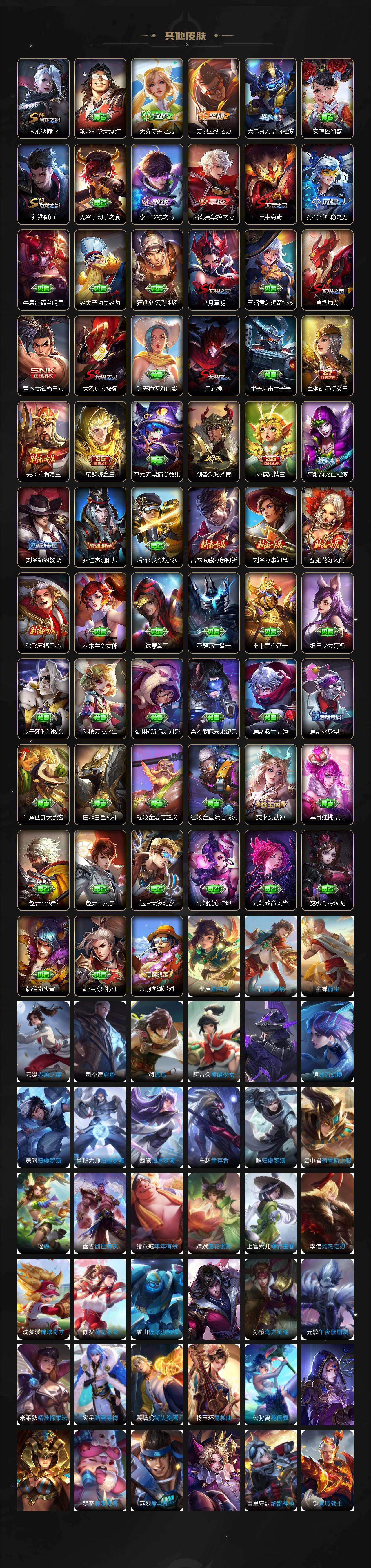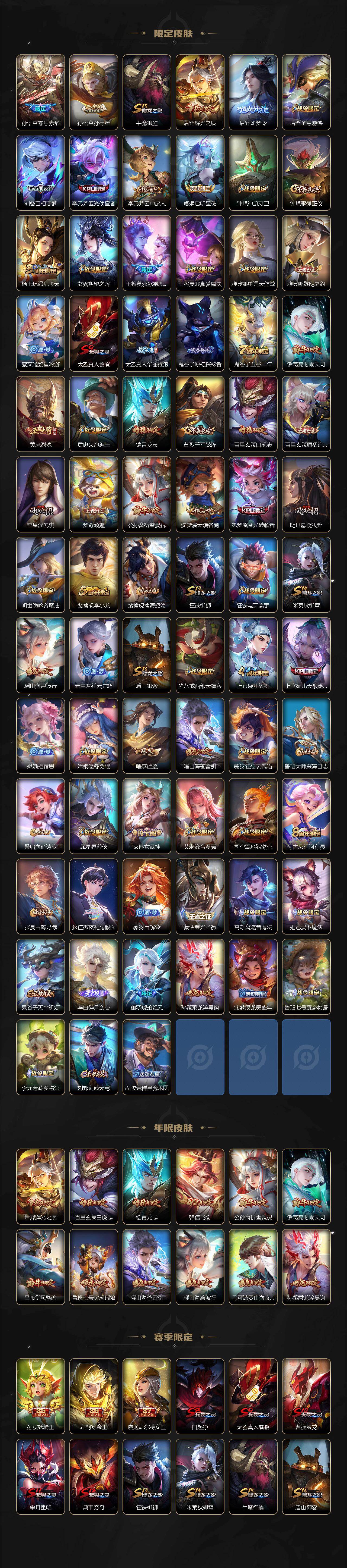 【限定皮肤】:白起狰,姜子牙天穹之誓,狄仁杰阴阳师,虞姬凯尔特女王,赵云皇家上将,赵云龙胆,墨子神迹守卫,嬴政优雅恋人,嬴政白昼王子,孙尚香蔷薇恋人,鲁班七号狮舞东方,鲁班七号寅虎瑞焰,庄周高山流水,高渐离死亡摇滚,阿轲迷踪丽影,钟无艳超时空战士,孙膑妖精王,扁鹊炼金王,白起夜都怪侠,芈月重明,芈月白晶晶,芈月幻夜卜梦,吕布猎兽之王,吕布御风骁将,周瑜赤莲之焰,元歌云间偶戏,元歌无心,夏侯惇朔风刀,甄姬游园惊梦,甄姬落雪兰心,曹操烛龙,典韦穷奇,典韦蓝屏警告,马可波罗暗影游猎,马可波罗山海玄木吟,狄仁杰魔术师,狄仁杰万华元夜,达摩沙漠行僧,项羽海滩派对,老夫子醍醐杖,老夫子航海奇遇记,关羽冰锋战神,关羽武圣,程咬金演武夺筹,刘邦夺宝奇兵,韩信飞衡,王昭君午后时光,兰陵王驯魔猎人,兰陵王金庭之子,不知火舞绯月行,橘右京枫霜尽,亚瑟潮玩骑士王,孙悟空至尊宝,孙悟空大圣娶亲,孙悟空零号赤焰,孙悟空孙行者,牛魔御旌,后羿辉光之辰,后羿如梦令,后羿圣弓游侠,刘备百相守梦,李元芳匿光侦查者,李元芳云中旅人,虞姬启明星使,钟馗神迹守卫,钟馗驱傩正仪,杨玉环遇见飞天,女娲朔望之晖,干将莫邪冰霜恋舞曲,干将莫邪真爱魔法,雅典娜单词大作战,雅典娜黎明之约,蔡文姬繁星吟游,太乙真人饕餮,太乙真人华丽摇滚,鬼谷子原初探秘者,鬼谷子五谷丰年,诸葛亮时雨天司,黄忠烈魂,黄忠火炮绅士,铠青龙志,苏烈千军破阵,百里玄策白虎志,百里玄策原初追逐者,弈星混沌棋,梦奇顽趣,公孙离祈雪灵祝,沈梦溪大漠名