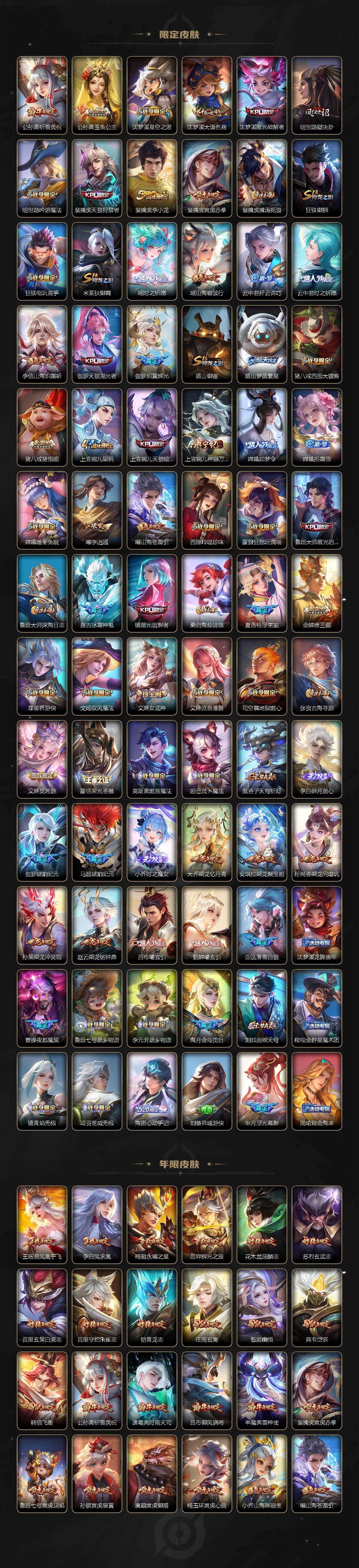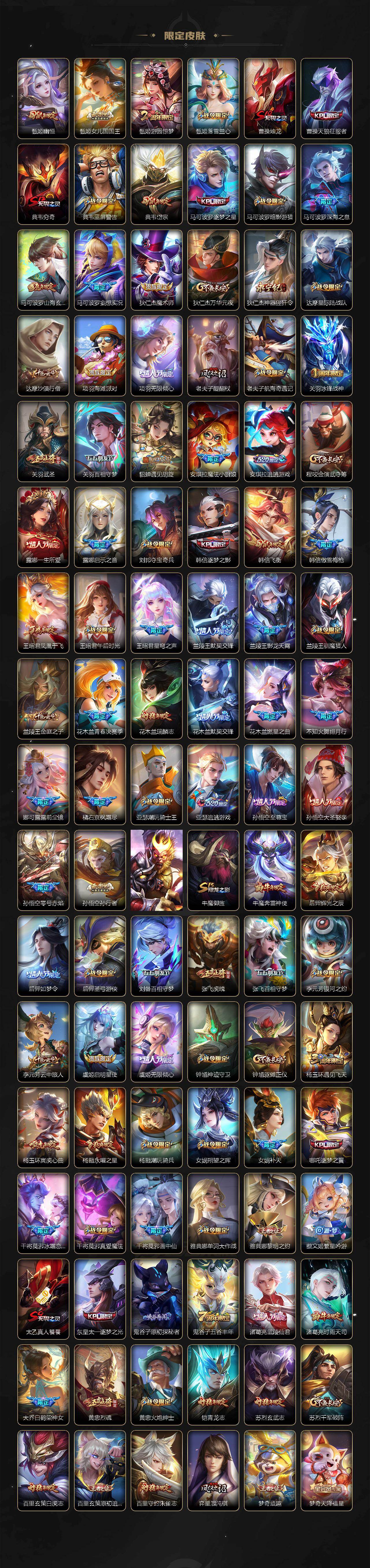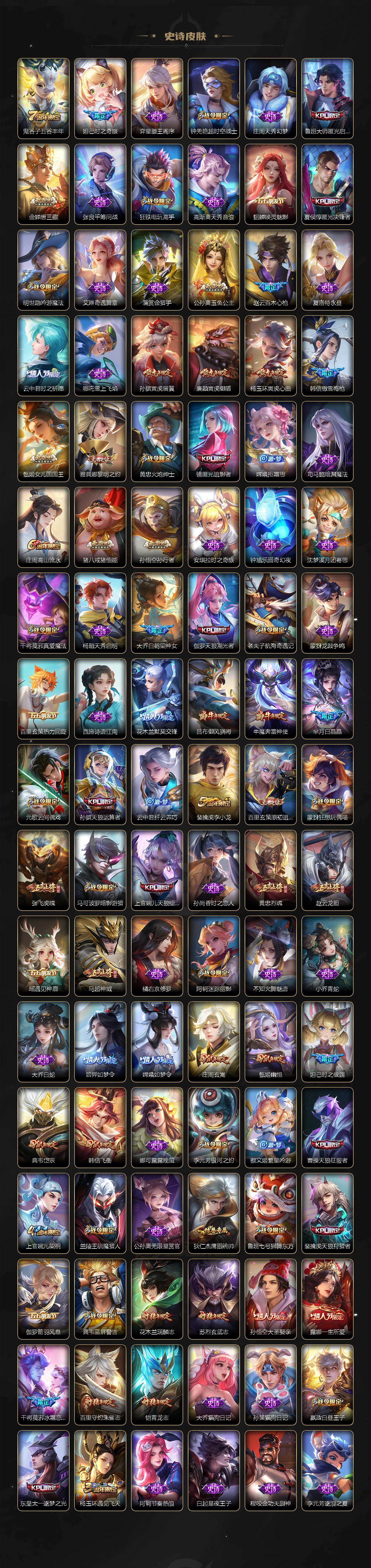 扁鹊炼金王,虞姬凯尔特女王,白起狰,太乙真人饕餮,曹操烛龙,芈月重明,典韦穷奇,狂铁御狮,米莱狄御霄,牛魔御旌,盾山御銮,夏侯惇朔风刀,明世隐疑决卦,老夫子醍醐杖,鬼谷子原初探秘者,狄仁杰万华元夜,程咬金演武夺筹,钟馗驱傩正仪,苏烈千军破阵,吕布猎兽之王,嬴政白昼王子,女娲朔望之晖,典韦蓝屏警告,钟馗神迹守卫,鲁班七号狮舞东方,沈梦溪星空之诺,李元芳银河之约,刘邦夺宝奇兵,马可波罗暗影游猎,蒙犽狂想玩偶喵,元歌云间偶戏,弈星混沌棋,达摩沙漠行僧,兰陵王金庭之子,沈梦溪大漠名商,李元芳云中旅人,桑启海盐诗旅,裴擒虎擒涛扼浪,鲁班大师探海日志,张良古海寻踪,项羽苍威无极,镜青焰无极