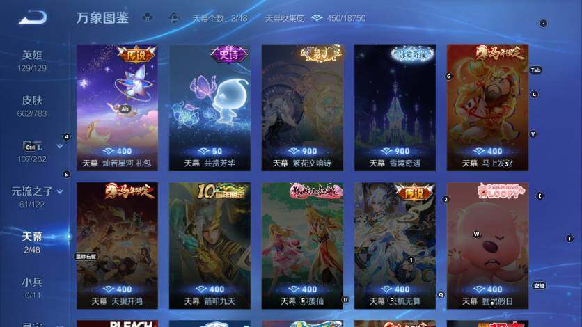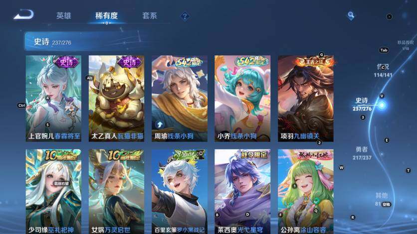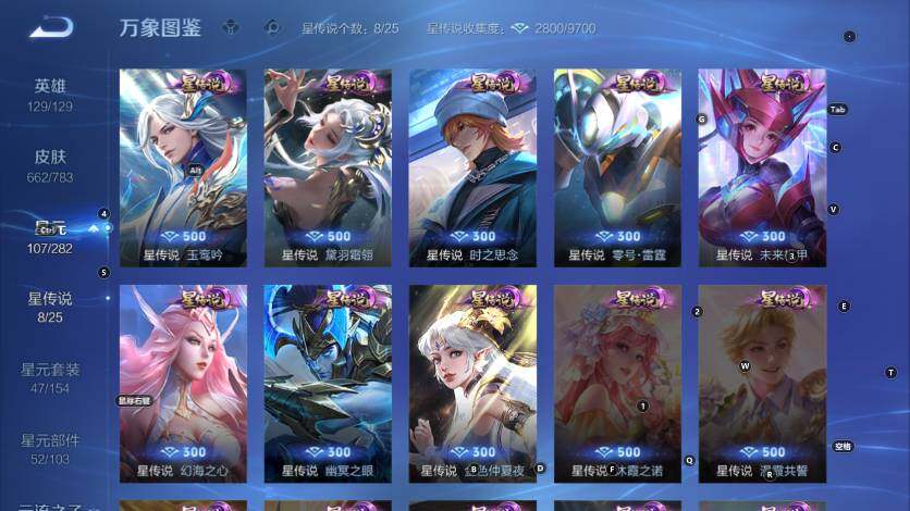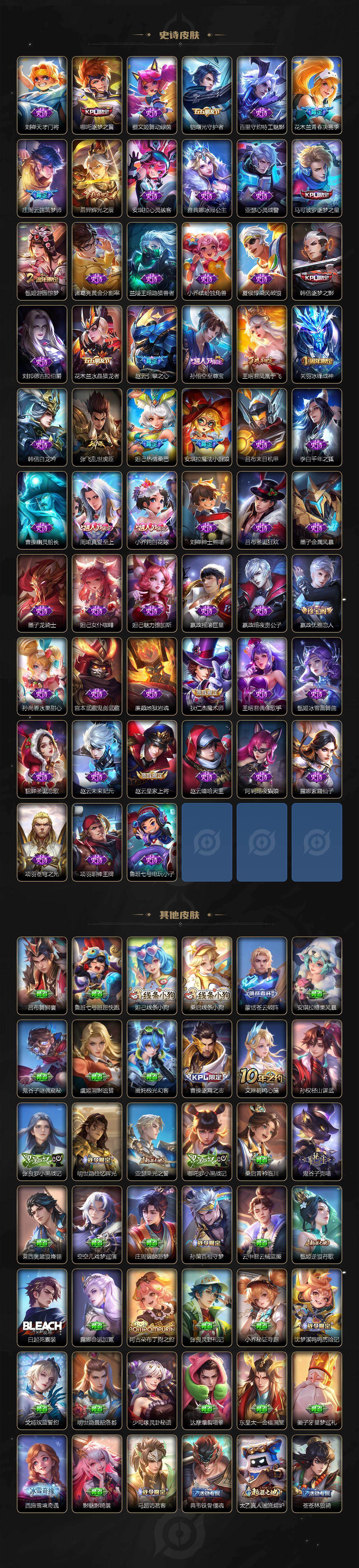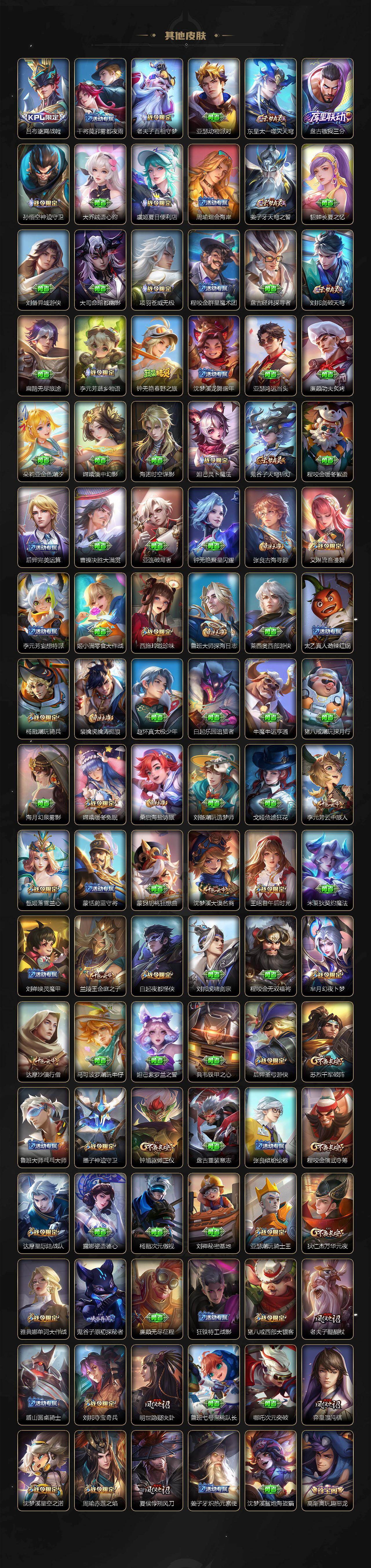 扁鹊炼金王,虞姬凯尔特女王,白起狰,太乙真人饕餮,曹操烛龙,芈月重明,典韦穷奇,狂铁御狮,米莱狄御霄,牛魔御旌,盾山御銮,夏侯惇朔风刀,明世隐疑决卦,老夫子醍醐杖,鬼谷子原初探秘者,狄仁杰万华元夜,程咬金演武夺筹,钟馗驱傩正仪,苏烈千军破阵,吕布猎兽之王,嬴政白昼王子,女娲朔望之晖,典韦蓝屏警告,钟馗神迹守卫,鲁班七号狮舞东方,沈梦溪星空之诺,李元芳银河之约,刘邦夺宝奇兵,马可波罗暗影游猎,蒙犽狂想玩偶喵,元歌云间偶戏,弈星混沌棋,达摩沙漠行僧,兰陵王金庭之子,沈梦溪大漠名商,李元芳云中旅人,桑启海盐诗旅,裴擒虎擒涛扼浪,鲁班大师探海日志,张良古海寻踪,项羽苍威无极,镜青焰无极