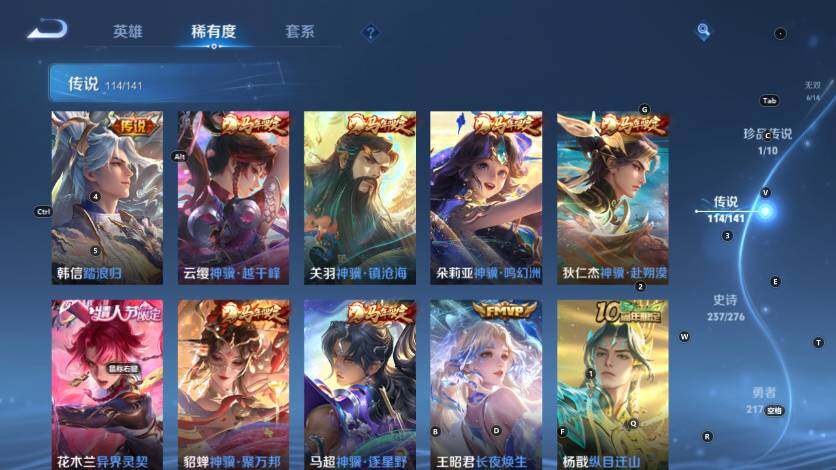 【传说皮肤】:韩信踏浪归,云缨神骥越千峰,关羽神骥镇沧海,朵莉亚神骥鸣幻洲,狄仁杰神骥赴朔漠,貂蝉神骥聚万邦,马超神骥逐星野,花木兰异界灵契,王昭君长夜焕生,杨戬纵目迁山,后羿神树通天,曹操万灵伏威,公孙离云诺千山,杨玉环星之鸣奏,后羿千劫归真,司空震愿照山河定,女娲愿照千秋盛,妲己愿照众生和,澜愿照九州拓,蔡文姬愿照福禄聚,虞姬愿照岁时盈,云缨幻光神枪,裴擒虎祥瑞亨通,嬴政玄雷天君,桑启鸣野蒿,庄周牧神诗旅,夏侯惇霜北刀,铠冥王哈迪斯,海月金乌负日,亚连落雪白狼,吕布曦玄引,貂蝉曦玄引,典韦战鼓燎原,孙尚香乘龙问璇玑,孙策乘龙淬吴钩,赵云乘龙铭钟鼎,马超琥珀纪元,澜逐花归海,艾琳觅芳踪,露娜霜月吟,兰陵王影龙天霄,吕布遇见神鼓,宫本武藏惊梅引,马可波罗妄想实况,澜电玩雷克斯,亚瑟追逃游戏,安琪拉追逃游戏,张飞百相守梦,公孙离记忆之芯,夏洛特浮生妄,干将莫邪画中仙,花木兰燃星之曲,虞姬无限倾心,项羽无限倾心,伽罗炽翼辉光,孙悟空齐天大圣,小乔山海琳琅生,曜山海苍雷引,李信山海炽霜斩,吕布怒海麟威,李白诗剑行,狄仁杰神器狴犴令,不知火舞绯月行,王昭君星穹之声,百里守约碎云,橘右京枫霜尽,娜可露露前尘镜,孙尚香音你闪耀,马可波罗深海之息,马超无双飞将,露娜启示之音,蔡