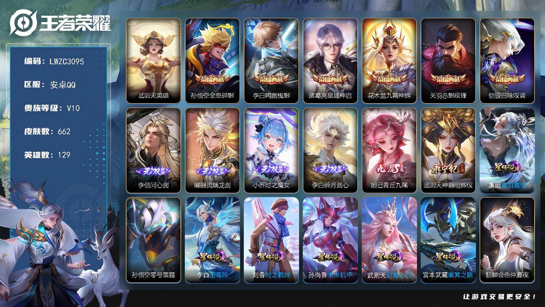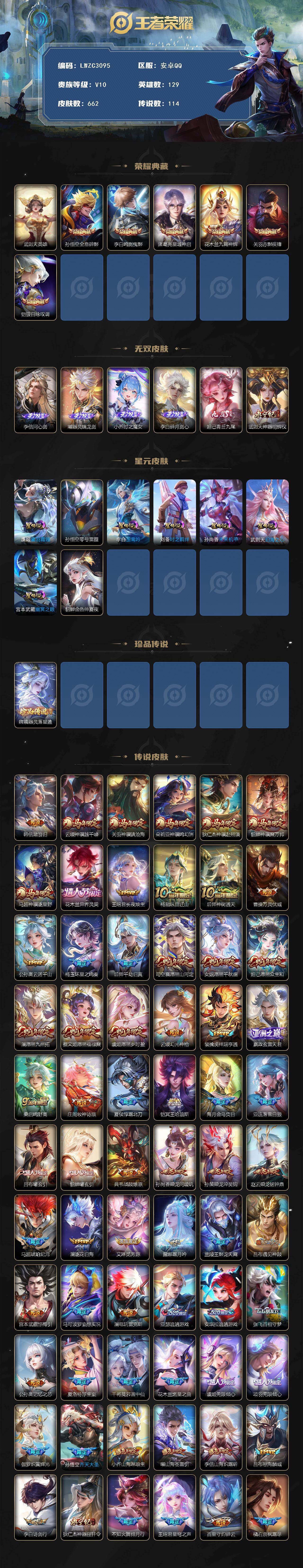 [17229270]【特价出售/店主推荐】6市标、打野47段、对抗路31段,安卓Q-V10-最强王者段位-129英雄-662皮肤-6典藏皮肤-1典藏英雄-6无双-1珍品传说-8星传说-114传说-235史诗 【英雄全皮】:廉颇全皮,赵云全皮,妲己全皮,嬴政全皮,刘禅全皮,阿轲全皮,扁鹊全皮,白起全皮,典韦全皮,李白全皮,露娜全皮,姜子牙全皮,刘邦全皮,孙权全皮,花木兰全皮,娜可露露全皮,橘右京全皮,杨玉环全皮,苍全皮,女娲全皮,鬼谷子全皮,黄忠全皮,梦奇全皮,沈梦溪全皮,狂铁全皮,李信全皮,盾山全皮,猪八戒全皮,亚连全皮,嫦娥全皮,马超全皮,敖隐全皮,曜全皮,鲁班大师全皮,蒙恬全皮,澜全皮,镜全皮,夏洛特全皮,司空震全皮,金蝉全皮,戈娅全皮,空空儿全皮,影全皮,海诺全皮,少司缘全皮 【荣耀典藏】:武则天英雄,孙悟空全息碎影,李白鸣剑曳影,诸葛亮星域神启,花木兰九霄神辉,关羽赤影疾锋,铠银白咏叹调 【无双皮肤】:李信问心剑,曜器灵螭龙剑,小乔时之魔女,李白碎月剑心,妲己青丘九尾,武则天神器明辉仪 【珍品传说】:嫦娥器灵落星盏 【传说皮肤】:韩信踏浪归,云缨神骥越千峰,关羽神骥镇沧海,朵莉亚神骥鸣幻洲,狄仁杰神骥赴朔漠,貂蝉神骥聚万邦,马超神骥逐星野,花木兰异界灵契,王昭君长夜焕生,杨戬纵目迁山,后羿神树通天,曹操万灵伏威,公孙离云诺千山,杨玉环星之鸣奏,后羿千劫归真,司空震愿照山河定,女娲愿照千秋盛,妲己愿照众生和,澜愿照九州拓,蔡文姬愿照福禄聚,虞姬愿照岁时盈,云缨幻光神枪,裴擒虎祥瑞亨通,嬴政玄雷天君,桑启鸣野蒿,庄周牧神诗旅,夏侯惇霜北刀,铠冥王哈迪斯,海月金乌负日,亚连落雪白狼,吕布曦玄引,貂蝉曦玄引,典韦战鼓燎原,孙尚香乘龙问璇玑,孙策乘龙淬吴钩,赵云乘龙铭钟鼎,马超琥珀纪元,澜逐花归海,艾琳觅芳踪,露娜霜月吟,兰陵王影龙天霄,吕布遇见神鼓,宫本武藏惊梅引,马可波罗妄想实况,澜电玩雷克斯,亚瑟追逃游戏,安琪拉追逃游戏,张飞百相守梦,公孙离记忆之芯,夏洛特浮生妄,干将莫邪画中仙,花木兰燃星之曲,虞姬无限倾心,项羽无限倾心,伽罗炽翼辉光,孙悟空齐天大圣,小乔山海琳琅生,曜山海苍雷引,李信山海炽霜斩,吕布怒海麟威,李白诗剑行,狄仁杰神器狴犴令,不知火舞绯月行,王昭君星穹之声,百里守约碎云,橘右京枫霜尽,娜可露露前尘镜,孙尚香音你闪耀,马可波罗深海之息,马超无双飞将,露娜启示之音,蔡