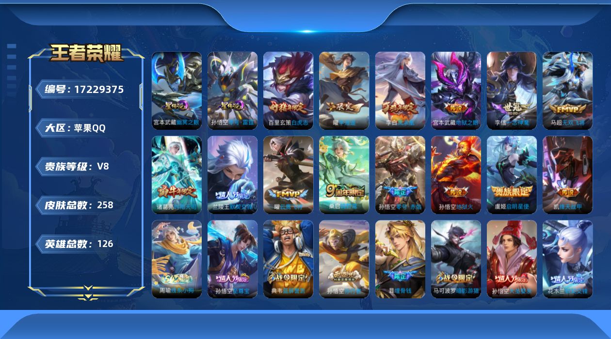 [17229375]苹果Q-258皮肤-14传说-70史诗 【英雄全皮】:孙权全皮 【传说皮肤】:桑启鸣野蒿,马超无双飞将,曜李逍遥 ,兰陵王默契交锋,诸葛亮时雨天司,铠绛天战甲,虞姬启明星使,孙悟空零号赤焰,曜云鹰飞将,李信一念神魔,百里玄策白虎志,李白凤求凰,宫本武藏地狱之眼,孙悟空地狱火 【限定皮肤】:暃埋骨钱,姜子牙天穹之誓,杨戬破阵退雄兵,狄仁杰阴阳师,赵云皇家上将,墨子神迹守卫,鲁班七号狮舞东方,庄周高山流水,阿轲迷踪丽影,钟无艳王者之锤,吕布猎兽之王,周瑜赤莲之焰,元歌云间偶戏,夏侯惇朔风刀,曹操天狼征服者,典韦蓝屏警告,马可波罗暗影游猎,狄仁杰魔术师,狄仁杰万华元夜,达摩星际陆战队,达摩沙漠行僧,项羽海滩派对,老夫子醍醐杖,老夫子航海奇遇记,程咬金演武夺筹,刘邦夺宝奇兵,韩信飞衡,兰陵王默契交锋,兰陵王驯魔猎人,兰陵王金庭之子,花木兰默契交锋,亚瑟潮玩骑士王,孙悟空至尊宝,孙悟空大圣娶亲,孙悟空零号赤焰,孙悟空孙行者,牛魔御旌,后羿如梦令,李元芳银河之约,虞姬启明星使,钟馗神迹守卫,钟馗驱傩正仪,女娲朔望之晖,雅典娜单词大作战,雅典娜黎明之约,蔡文姬繁星吟游,鬼谷子原初探秘者,诸葛亮时雨天司,黄忠烈魂,苏烈千军破阵,百里玄策白虎志,弈星混沌棋,沈梦溪星空之诺,沈梦溪大漠名商,明世隐疑决卦,裴擒虎李小龙,裴擒虎擒涛扼浪,米莱狄御霄,米莱狄胡桃异想国,云中君纤云弄巧,伽罗天狼溯光者,盾山御銮,猪八戒西部大镖客,上官婉儿梁祝,上官婉儿天狼绘梦者,嫦娥如梦令,曜李逍遥 ,蒙犽狂想玩偶喵,鲁班大师探海日志,桑启海盐诗旅,艾琳女武神,张良古海寻踪,蒙恬荣光圣徽,鬼谷子天穹祈灯,沈梦溪龙舞盛年,刘邦剑破天穹,镜青焰无极,项羽苍威无极,周瑜熔金海岸 【年限皮肤】:李白凤求凰,百里玄策白虎志,韩信飞衡,诸葛亮时雨天司 【赛季限定】:米莱狄御霄,牛魔御旌,盾山御銮,夏侯惇朔风刀,弈星混沌棋,明世隐疑决卦,老夫子醍醐杖,鬼谷子原初探秘者,狄仁杰万华元夜,程咬金演武夺筹,钟馗驱傩正仪,苏烈千军破阵,达摩沙漠行僧,兰陵王金庭之子,沈梦溪大漠名商,桑启海盐诗旅,裴擒虎擒涛扼浪,鲁班大师探海日志,张良古海寻踪,鬼谷子天穹祈灯,刘邦剑破天穹,姜子牙天穹之誓,东皇太一噬灭天穹,太乙真人谧流熔炉,雅典娜黎明之约,蒙恬荣光圣徽,牛魔星界战将 【战令限定】:吕布猎兽之王,典韦蓝屏警告,女娲朔望之晖,鲁班七号