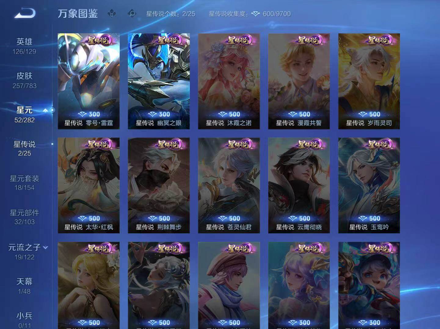 米莱狄御霄,牛魔御旌,盾山御銮,夏侯惇朔风刀,明世隐疑决卦,老夫子醍醐杖,鬼谷子原初探秘者,狄仁杰万华元夜,程咬金演武夺筹,钟馗驱傩正仪,苏烈千军破阵,吕布猎兽之王,女娲朔望之晖,典韦蓝屏警告,钟馗神迹守卫,鲁班七号狮舞东方,沈梦溪星空之诺,李元芳银河之约,刘邦夺宝奇兵,马可波罗暗影游猎,蒙犽狂想玩偶喵,元歌云间偶戏,弈星混沌棋,达摩沙漠行僧,兰陵王金庭之子,沈梦溪大漠名商,桑启海盐诗旅,裴擒虎擒涛扼浪,鲁班大师探海日志,张良古海寻踪,项羽苍威无极,镜青焰无极