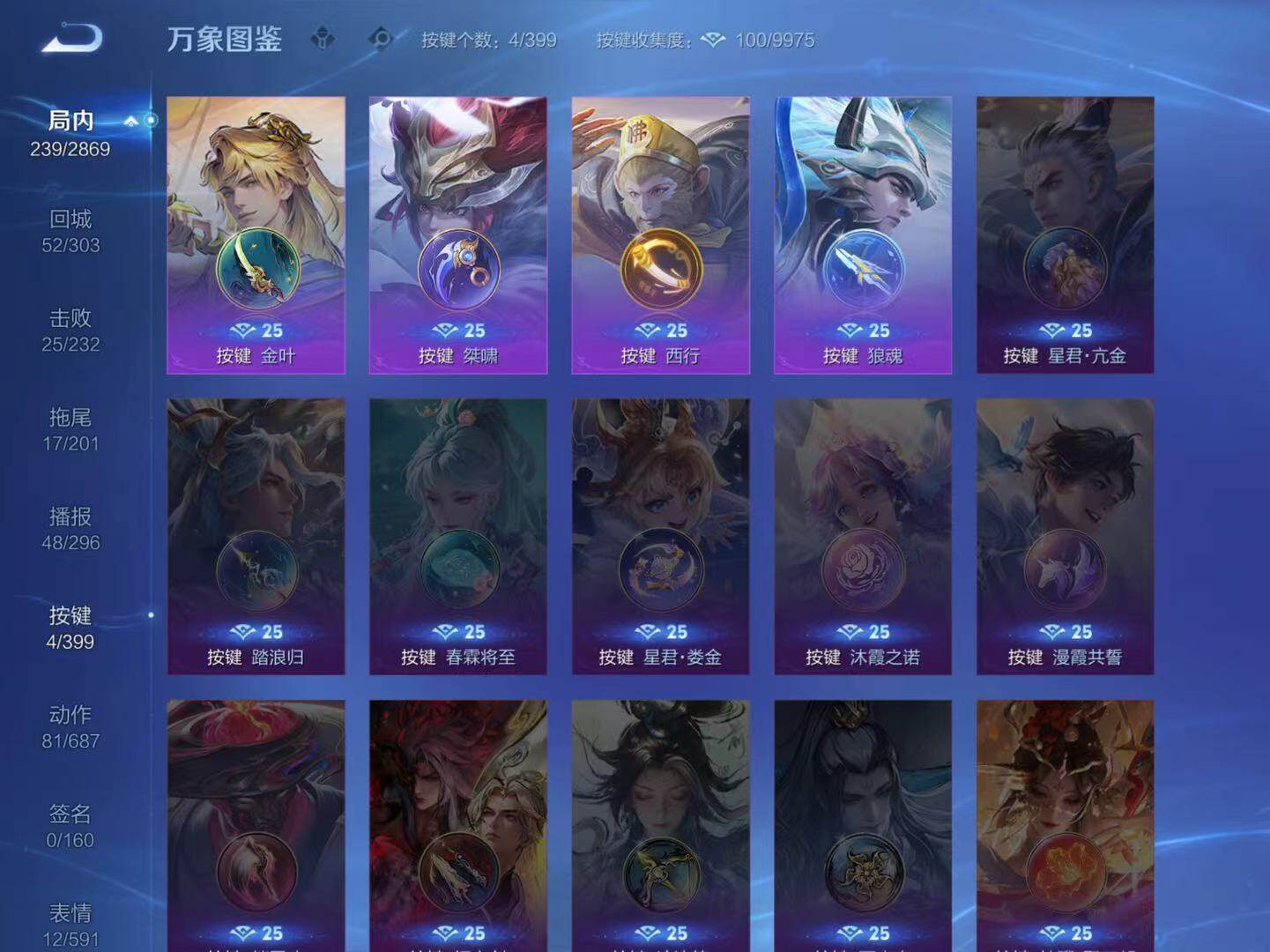 裴擒虎李小龙,上官婉儿梁祝,诸葛亮时雨天司,黄忠烈魂,韩信飞衡,曹操天狼征服者,上官婉儿天狼绘梦者,伽罗天狼溯光者,百里玄策白虎志,孙悟空大圣娶亲,花木兰默契交锋,兰陵王默契交锋,后羿如梦令,嫦娥如梦令,孙悟空至尊宝,雅典娜神奇女侠,孙悟空孙行者,桑启鸣野蒿