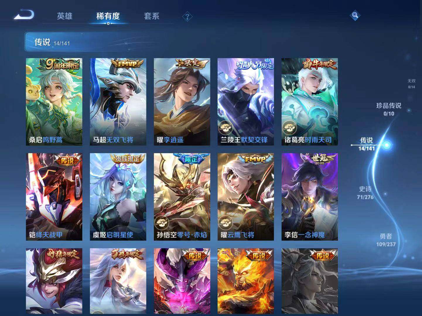 【限定皮肤】:暃埋骨钱,姜子牙天穹之誓,杨戬破阵退雄兵,狄仁杰阴阳师,赵云皇家上将,墨子神迹守卫,鲁班七号狮舞东方,庄周高山流水,阿轲迷踪丽影,钟无艳王者之锤,吕布猎兽之王,周瑜赤莲之焰,元歌云间偶戏,夏侯惇朔风刀,曹操天狼征服者,典韦蓝屏警告,马可波罗暗影游猎,狄仁杰魔术师,狄仁杰万华元夜,达摩星际陆战队,达摩沙漠行僧,项羽海滩派对,老夫子醍醐杖,老夫子航海奇遇记,程咬金演武夺筹,刘邦夺宝奇兵,韩信飞衡,兰陵王默契交锋,兰陵王驯魔猎人,兰陵王金庭之子,花木兰默契交锋,亚瑟潮玩骑士王,孙悟空至尊宝,孙悟空大圣娶亲,孙悟空零号赤焰,孙悟空孙行者,牛魔御旌,后羿如梦令,李元芳银河之约,虞姬启明星使,钟馗神迹守卫,钟馗驱傩正仪,女娲朔望之晖,雅典娜单词大作战,雅典娜黎明之约,蔡文姬繁星吟游,鬼谷子原初探秘者,诸葛亮时雨天司,黄忠烈魂,苏烈千军破阵,百里玄策白虎志,弈星混沌棋,沈梦溪星空之诺,沈梦溪大漠名商,明世隐疑决卦,裴擒虎李小龙,裴擒虎擒涛扼浪,米莱狄御霄,米莱狄胡桃异想国,云中君纤云弄巧,伽罗天狼溯光者,盾山御銮,猪八戒西部大镖客,上官婉儿梁祝,上官婉儿天狼绘梦者,嫦娥如梦令,曜李逍遥 ,蒙犽狂想玩偶喵,鲁班大师探海日志,桑启海盐诗旅,艾琳女武神,张良古海寻踪,蒙恬荣光圣徽,鬼谷子天穹祈灯,沈梦溪龙舞盛年,刘邦剑破天穹,镜青焰无极,项羽苍威无极,周瑜熔金海岸