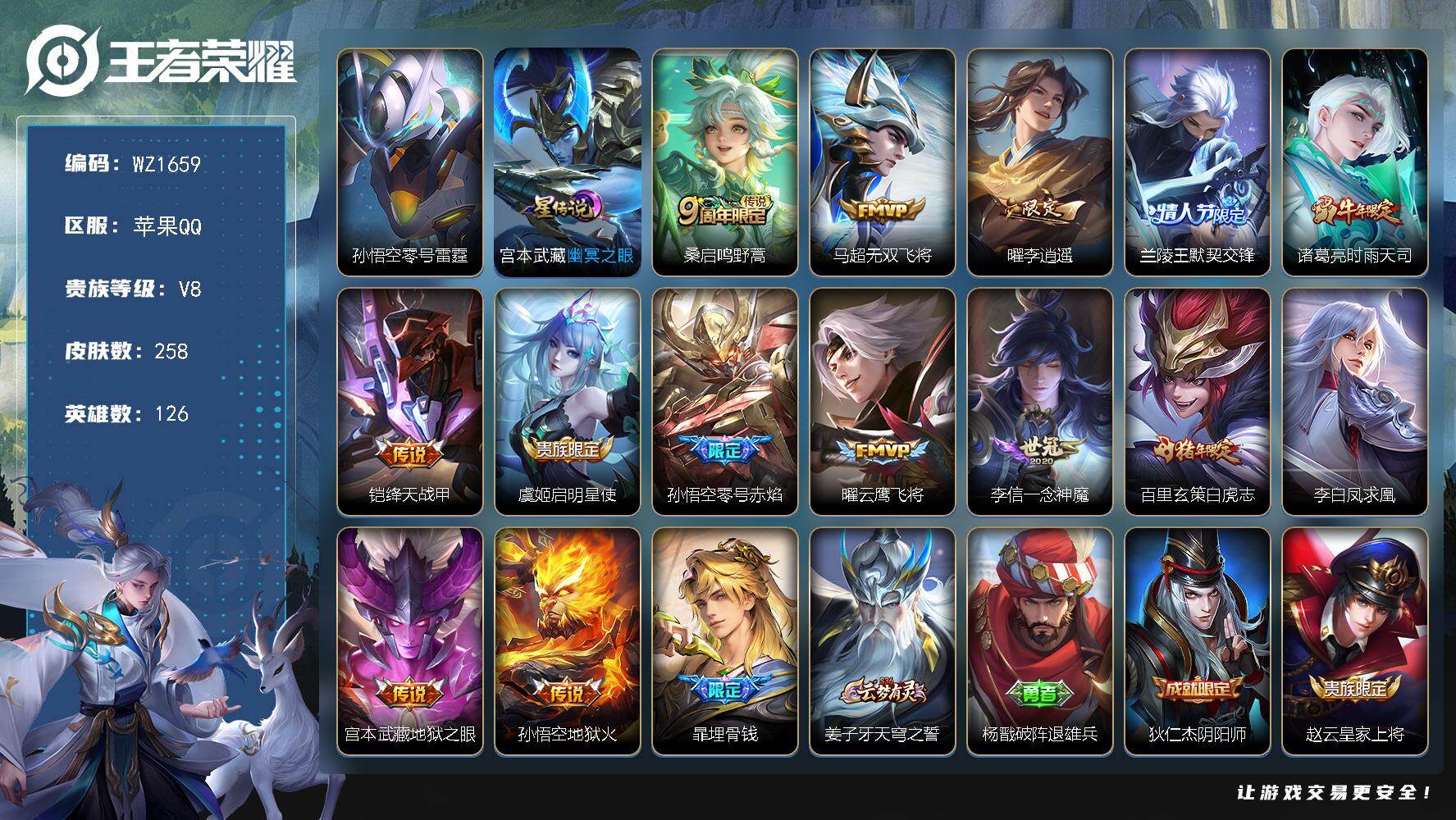 - [16979093]苹果WX-V10-最强王者段位-129英雄-567皮肤-11典藏皮肤-1典藏英雄-4无双-3珍品传说-8星传说-75传说-193史诗-2天幕 【英雄全皮】:赵云全皮,刘禅全皮,刘邦全皮,孙权全皮,娜可露露全皮,杨玉环全皮,东皇太一全皮,鬼谷子全皮,黄忠全皮,梦奇全皮,沈梦溪全皮,猪八戒全皮,亚连全皮,敖隐全皮,海月全皮,蒙犽全皮,鲁班大师全皮,夏洛特全皮,司空震全皮,金蝉全皮,赵怀真全皮,莱西奥全皮,戈娅全皮,空空儿全皮,影全皮,海诺全皮 【荣耀典藏】:武则天英雄,孙悟空全息碎影,夏侯惇无限飓风号,小乔天鹅之梦,孙尚香杀手不太冷,鲁班七号星空梦想,芈月大秦宣太后,李白鸣剑曳影,诸葛亮星域神启,貂蝉幻阙歌,韩信弑枪猎影,瑶拾光映像 【无双皮肤】:李白碎月剑心,甄姬雪境奇遇,曜器灵螭龙剑,孙悟空无相 【珍品传说】:孙策时之奇旅,张飞兔狲蓬尾,暃朽木白哉 【传说皮肤】:后羿神树通天,公孙离云诺千山,西施续相思,杨玉环星之鸣奏,司空震愿照山河定,女娲愿照千秋盛,妲己愿照众生和,澜愿照九州拓,蔡文姬愿照福禄聚,虞姬愿照岁时盈,云缨幻光神枪,裴擒虎祥瑞亨通,嬴政玄雷天君,桑启鸣野蒿,朵莉亚心动手记,海月金乌负日,亚连落雪白狼,典韦战鼓燎原,赵云乘龙铭钟鼎,马超琥珀纪元,铠琥珀纪元,澜逐花归海,艾琳觅芳踪,云缨鹤归松栖,东皇太一灼幽烈阳,诸葛亮鹤羽星尊,夏洛特浮生妄,孙悟空齐天大圣,李信山海炽霜斩,吕布怒海麟威,李白诗剑行,狄仁杰神器狴犴令,不知火舞绯月行,王昭君星穹之声,百里守约碎云,娜可露露前尘镜,马可波罗深海之息,后羿无尽星芒,马超无双飞将,孙策挚爱之约,蔡文姬花朝如约,裴擒虎寅虎赤拳,孙尚香异界灵契,赵云淬星耀世,王昭君乞巧织情,西施游龙清影,曜李逍遥 ,周瑜音你心动,小乔音你心动,李元芳飞鸢探春,兰陵王默契交锋,诸葛亮时雨天司,铠绛天战甲,镜炽阳神光,虞姬启明星使,孙悟空零号赤焰,关羽武圣,曜云鹰飞将,李信一念神魔,刘备时之恋人,伽罗太华,貂蝉猫影幻舞,张良黄金白羊座,干将莫邪久胜战神,虞姬云霓雀翎,达摩黄金狮子座,百里玄策白虎志,花木兰冠军飞将,梦奇胖达荣荣,后羿黄金射手座,诸葛亮武陵仙君,貂蝉仲夏夜之梦,宫本武藏地狱之眼,武则天海洋之心,狄仁杰超时空战士 【限定皮肤】:蒙犽顽岩魄,蔡文姬夏日便利店,虞姬夏日便利店,姜子牙天穹之誓,杨戬破阵退雄兵,李白谪仙醉月,狄仁