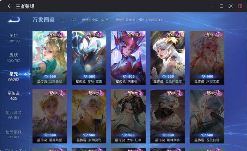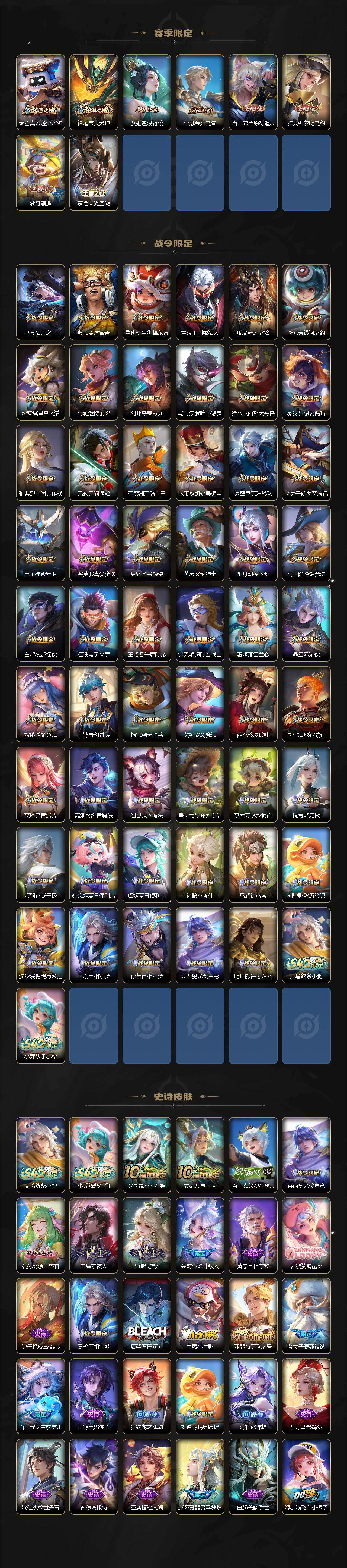 扁鹊炼金王,太乙真人饕餮,盾山御銮,夏侯惇朔风刀,明世隐疑决卦,老夫子醍醐杖,鬼谷子原初探秘者,狄仁杰万华元夜,程咬金演武夺筹,钟馗驱傩正仪,苏烈千军破阵,吕布猎兽之王,典韦蓝屏警告,鲁班七号狮舞东方,沈梦溪星空之诺,李元芳银河之约,刘邦夺宝奇兵,马可波罗暗影游猎,蒙犽狂想玩偶喵,元歌云间偶戏,弈星混沌棋,达摩沙漠行僧,兰陵王金庭之子,沈梦溪大漠名商,李元芳云中旅人,桑启海盐诗旅,裴擒虎擒涛扼浪,鲁班大师探海日志,张良古海寻踪,项羽苍威无极,镜青焰无极