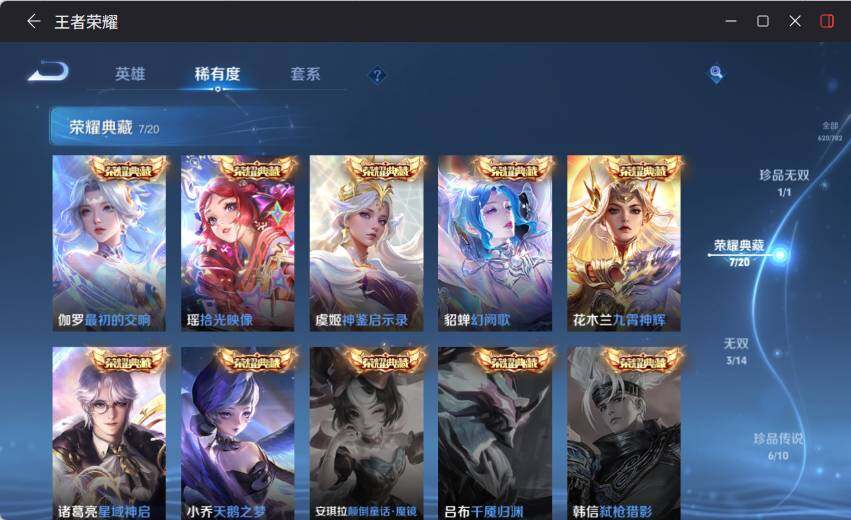 【荣耀典藏】:小乔天鹅之梦,诸葛亮星域神启,花木兰九霄神辉,貂蝉幻阙歌,虞姬神鉴启示录,瑶拾光映像,伽罗最初的交响