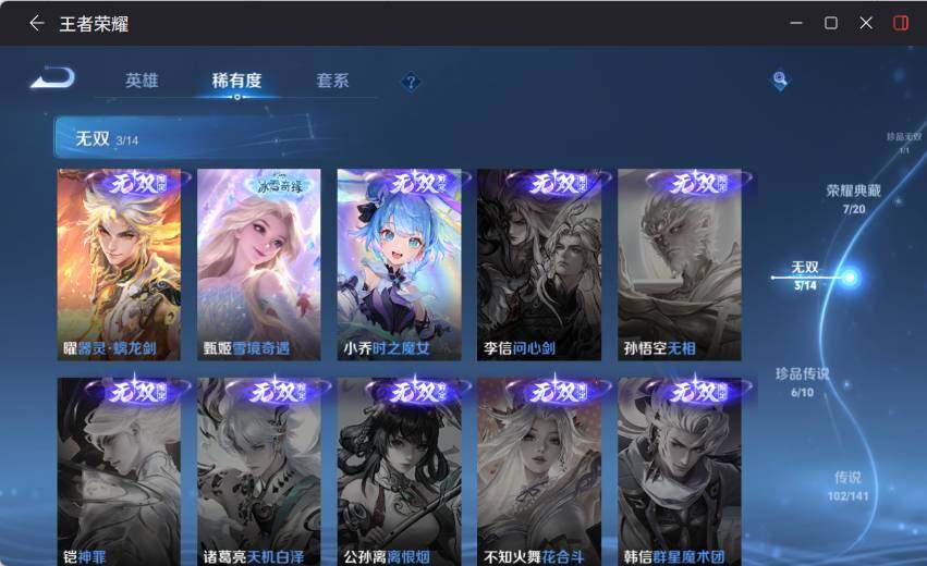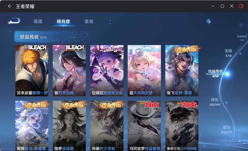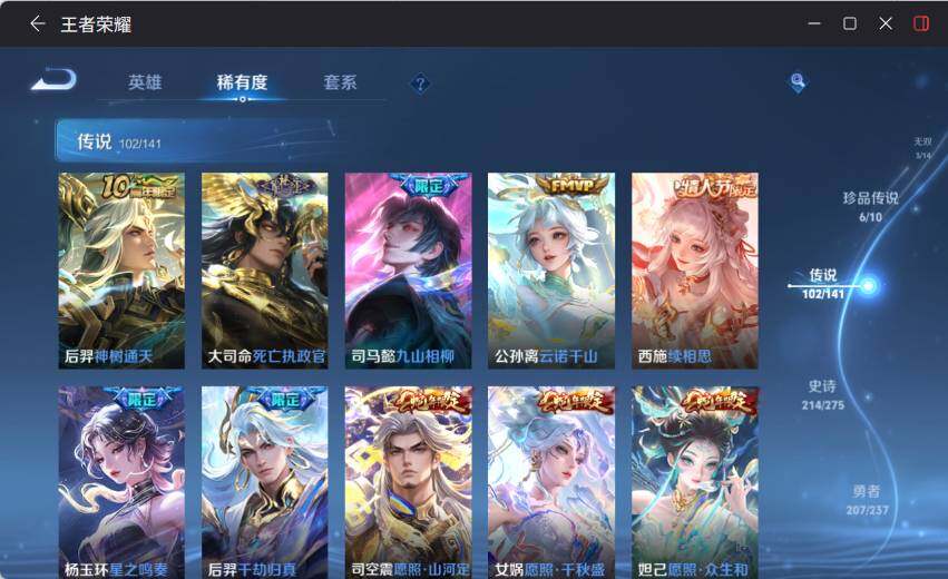 - PX_2091219-贵族6/皮肤159/典藏1/传说3/史诗40/英雄124/银白咏叹调/蔷薇恋人/特工战影/黄金狮子座/怒海麟威/桑启鸣野蒿/姜子牙天穹之誓/狄仁杰阴阳师/赵云皇家上将/蔷薇恋人/狄仁杰魔术师/万华元夜/项羽海滩派对/醍醐杖/演武夺筹/金庭之子/云中旅人/驱傩正仪/杨玉环遇见飞天/原初探秘者/千军破阵/混沌棋/大漠名商/疑决卦/李小龙/擒涛扼浪/云中君纤云弄巧/天狼绘梦者/探海