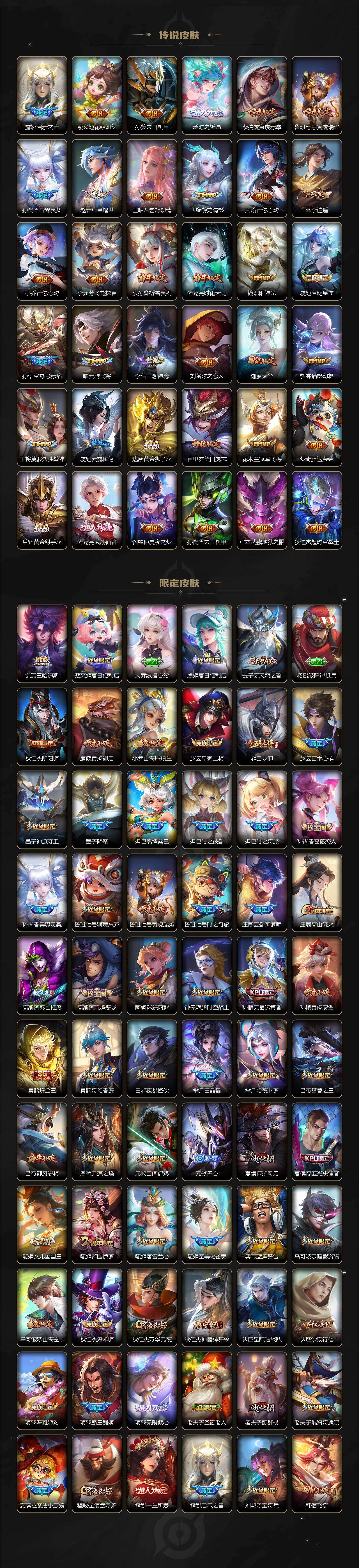 【传说皮肤】:后羿神树通天,大司命死亡执政官,司马懿九山相柳,公孙离云诺千山,西施续相思,杨玉环星之鸣奏,后羿千劫归真,司空震愿照山河定,女娲愿照千秋盛,妲己愿照众生和,澜愿照九州拓,蔡文姬愿照福禄聚,虞姬愿照岁时盈,云缨幻光神枪,裴擒虎祥瑞亨通,王昭君映山客,桑启鸣野蒿,铠冥王哈迪斯,朵莉亚心动手记,云中君群星魔术团,墨子黄金天蝎座,海月金乌负日,亚连落雪白狼,吕布曦玄引,貂蝉曦玄引,典韦战鼓燎原,孙尚香乘龙问璇玑,孙策乘龙淬吴钩,赵云乘龙铭钟鼎,铠琥珀纪元,澜逐花归海,艾琳觅芳踪,露娜霜月吟,狄仁杰夜礼服假面,王昭君永恒水手月亮,甄姬至美化雀舞,大乔时之奇旅,鲁班七号时之奇旅,宫本武藏惊梅引,云缨鹤归松栖,上官婉儿妄想奇谈,东皇太一灼幽烈阳,诸葛亮鹤羽星尊,公孙离记忆之芯,夏洛特浮生妄,干将莫邪画中仙,花木兰燃星之曲,虞姬无限倾心,项羽无限倾心,伽罗炽翼辉光,孙悟空齐天大圣,小乔山海琳琅生,曜山海苍雷引,李信山海炽霜斩,吕布怒海麟威,李白诗剑行,狄仁杰神器狴犴令,不知火舞绯月行,王昭君星穹之声,橘右京枫霜尽,娜可露露前尘镜,孙尚香音你闪耀,后羿无尽星芒,马超无双飞将,大乔挚爱花嫁,孙策挚爱之约,露娜启示之音,蔡文姬花朝如约,孙策末日机甲,瑶时之