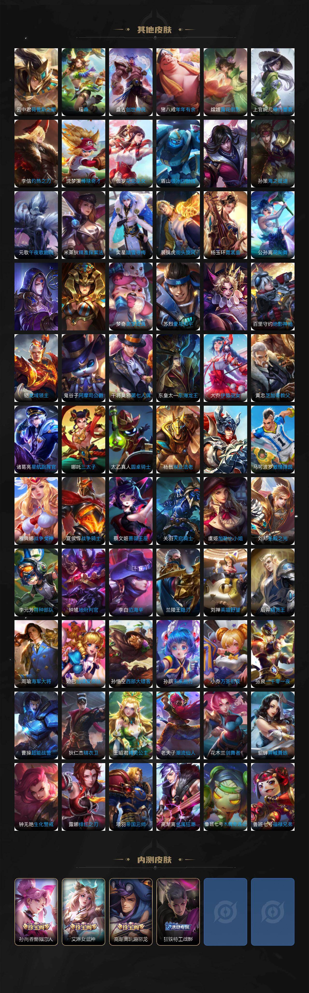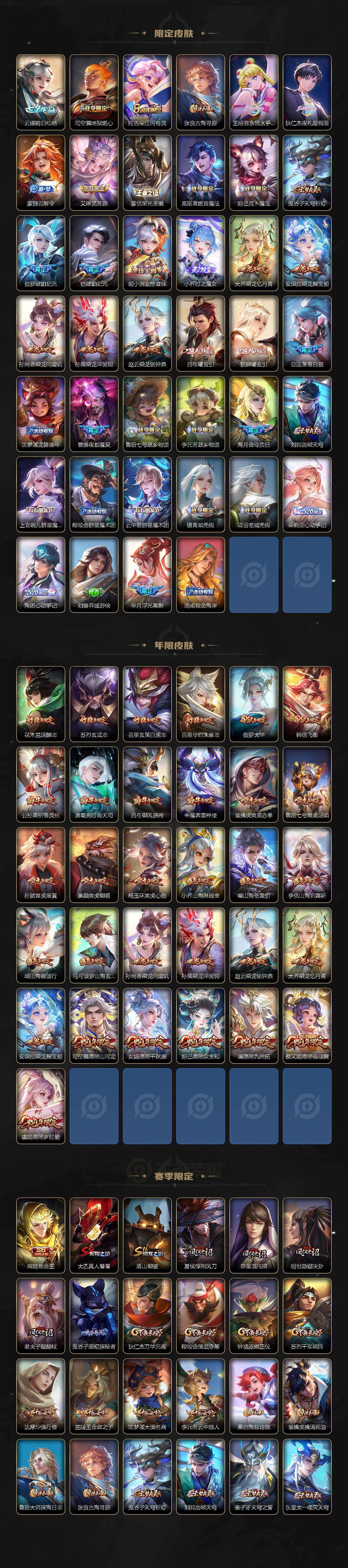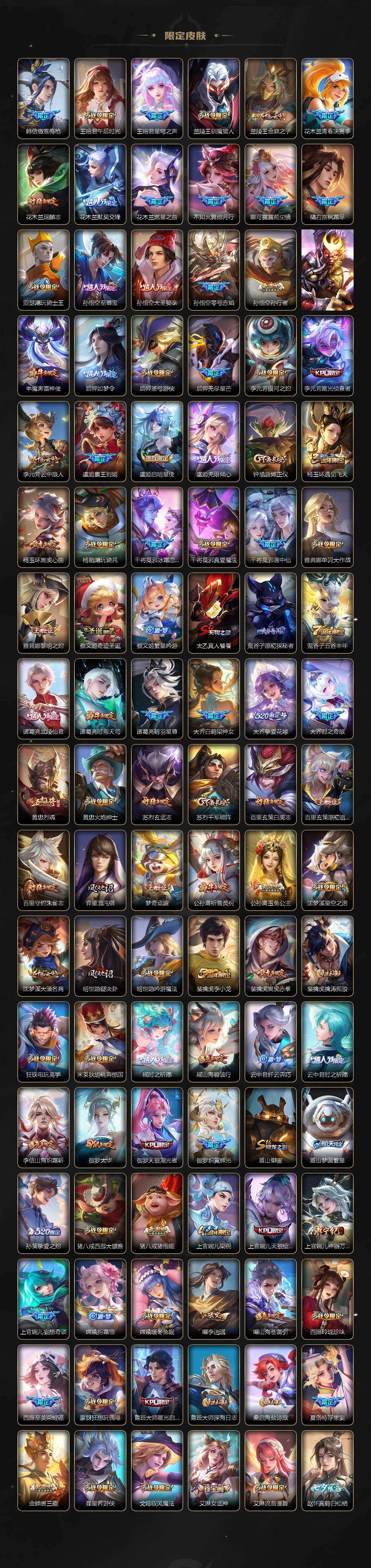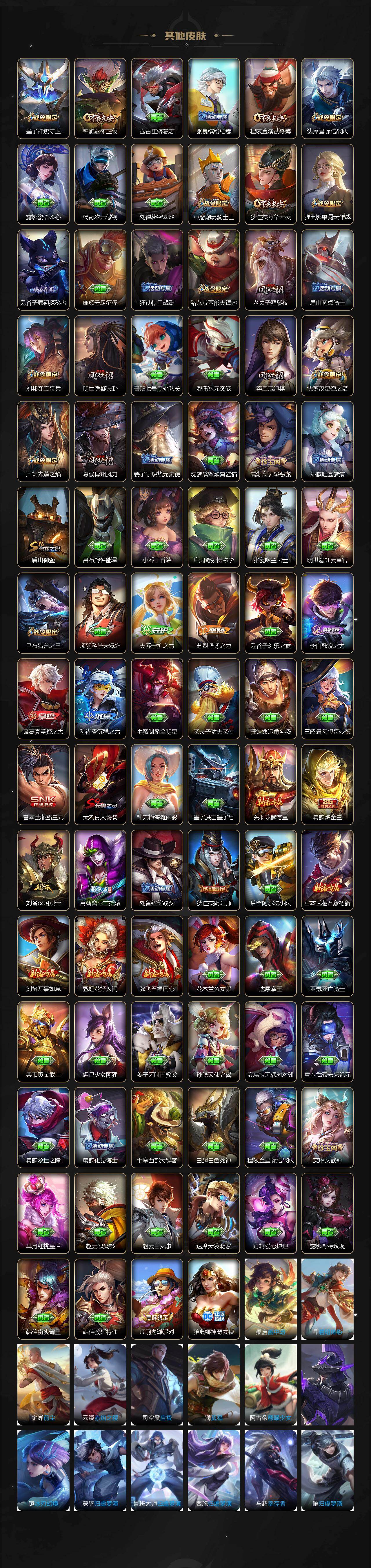 裴擒虎李小龙,上官婉儿梁祝,牛魔奔雷神使,公孙离祈雪灵祝,吕布御风骁将,诸葛亮时雨天司,赵云龙胆,黄忠烈魂,韩信飞衡,伽罗太华,孙膑天狼运算者,上官婉儿天狼绘梦者,伽罗天狼溯光者,百里玄策白虎志,花木兰瑞麟志,苏烈玄武志,百里守约朱雀志,项羽霸王别姬,虞姬霸王别姬,孙悟空大圣娶亲,露娜一生所爱,花木兰默契交锋,后羿如梦令,孙悟空至尊宝,雅典娜神奇女侠,妲己热情桑巴,干将莫邪冰霜恋舞曲,花木兰青春决赛季,蔡文姬奇迹圣诞,妲己时之彼端,芈月白晶晶,安琪拉魔法小厨娘,庄周云端筑梦师,大乔白鹤梁神女,猪八戒猪悟能,廉颇寅虎·御盾,孙尚香异界灵契,老夫子圣诞老人,孙悟空孙行者,甄姬女儿国国王,韩信傲雪梅枪,鲁班七号寅虎·瑞焰,孙膑寅虎·展翼,杨玉环寅虎·心曲,裴擒虎寅虎·赤拳,云中君时之祈愿,瑶时之祈愿,赵云百木心枪,公孙离玉兔公主,露娜启示之音,夏侯惇匿光决锋者,后羿无尽星芒,金蝉唐三藏,娜可露露前尘镜,橘右京枫霜尽,鲁班大师匿光启智者,妲己时之奇旅,王昭君星穹之声,不知火舞绯月行,上官婉儿神器·万象笔,盾山梦圆繁星,墨子降魔,李白诗剑行,马可波罗山海·玄木吟,瑶山海·碧波行,西施至美·乘鲤谣,甄姬至美·化雀舞,桑启鸣野蒿,艾琳陌上桑,王昭君映山客,澜愿照·九州拓,蔡文姬愿照·福禄聚,虞姬愿照·岁时盈,司空震愿照·山河定,妲己愿照·众生和,女娲愿照·千秋盛