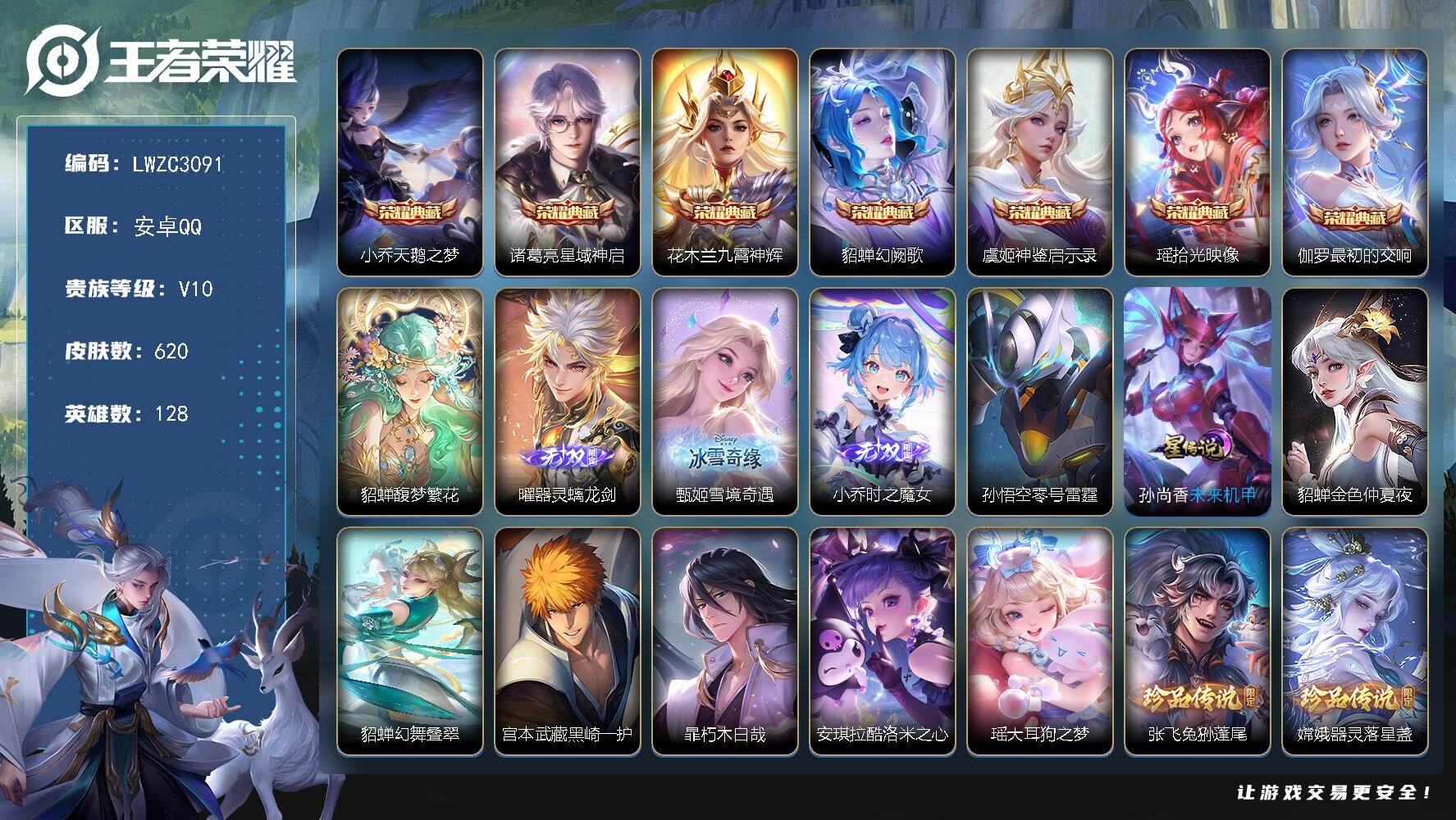 [17229494]【特价出售/店主推荐/1市标/31段打野/2930星币】:安卓Q-V10-至尊星耀I段位-128英雄-620皮肤-7典藏皮肤-1珍品无双-3无双-4星元-6珍品传说-102传说-212史诗 【英雄全皮】:墨子全皮,刘禅全皮,扁鹊全皮,宫本武藏全皮,达摩全皮,司马懿全皮,露娜全皮,刘邦全皮,孙权全皮,艾琳全皮,娜可露露全皮,橘右京全皮,杨玉环全皮,苍全皮,雅典娜全皮,鬼谷子全皮,大乔全皮,黄忠全皮,苏烈全皮,云中君全皮,盾山全皮,猪八戒全皮,大司命全皮,海月全皮,曜全皮,西施全皮,鲁班大师全皮,蒙恬全皮,阿古朵全皮,桑启全皮,夏洛特全皮,司空震全皮,金蝉全皮,赵怀真全皮,戈娅全皮,空空儿全皮,影全皮,海诺全皮,少司缘全皮 【荣耀典藏】:小乔天鹅之梦,诸葛亮星域神启,花木兰九霄神辉,貂蝉幻阙歌,虞姬神鉴启示录,瑶拾光映像,伽罗最初的交响 【珍品无双】:貂蝉馥梦繁花 【无双皮肤】:曜器灵螭龙剑,甄姬雪境奇遇,小乔时之魔女 【珍品传说】:宫本武藏黑崎一护,暃朽木白哉,安琪拉酷洛米之心,瑶大耳狗之梦,张飞兔狲蓬尾,嫦娥器灵落星盏 【传说皮肤】:后羿神树通天,大司命死亡执政官,司马懿九山相柳,公孙离云诺千山,西施续相思,杨玉环星之鸣奏,后羿千劫归真,司空震愿照山河定,女娲愿照千秋盛,妲己愿照众生和,澜愿照九州拓,蔡文姬愿照福禄聚,虞姬愿照岁时盈,云缨幻光神枪,裴擒虎祥瑞亨通,王昭君映山客,桑启鸣野蒿,铠冥王哈迪斯,朵莉亚心动手记,云中君群星魔术团,墨子黄金天蝎座,海月金乌负日,亚连落雪白狼,吕布曦玄引,貂蝉曦玄引,典韦战鼓燎原,孙尚香乘龙问璇玑,孙策乘龙淬吴钩,赵云乘龙铭钟鼎,铠琥珀纪元,澜逐花归海,艾琳觅芳踪,露娜霜月吟,狄仁杰夜礼服假面,王昭君永恒水手月亮,甄姬至美化雀舞,大乔时之奇旅,鲁班七号时之奇旅,宫本武藏惊梅引,云缨鹤归松栖,上官婉儿妄想奇谈,东皇太一灼幽烈阳,诸葛亮鹤羽星尊,公孙离记忆之芯,夏洛特浮生妄,干将莫邪画中仙,花木兰燃星之曲,虞姬无限倾心,项羽无限倾心,伽罗炽翼辉光,孙悟空齐天大圣,小乔山海琳琅生,曜山海苍雷引,李信山海炽霜斩,吕布怒海麟威,李白诗剑行,狄仁杰神器狴犴令,不知火舞绯月行,王昭君星穹之声,橘右京枫霜尽,娜可露露前尘镜,孙尚香音你闪耀,后羿无尽星芒,马超无双飞将,大乔挚爱花嫁,孙策挚爱之约,露娜启示之音,蔡文姬花朝如约,孙策末日机甲,瑶时之