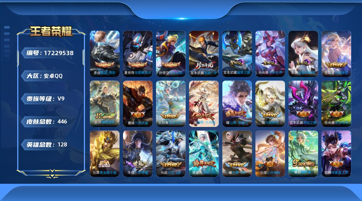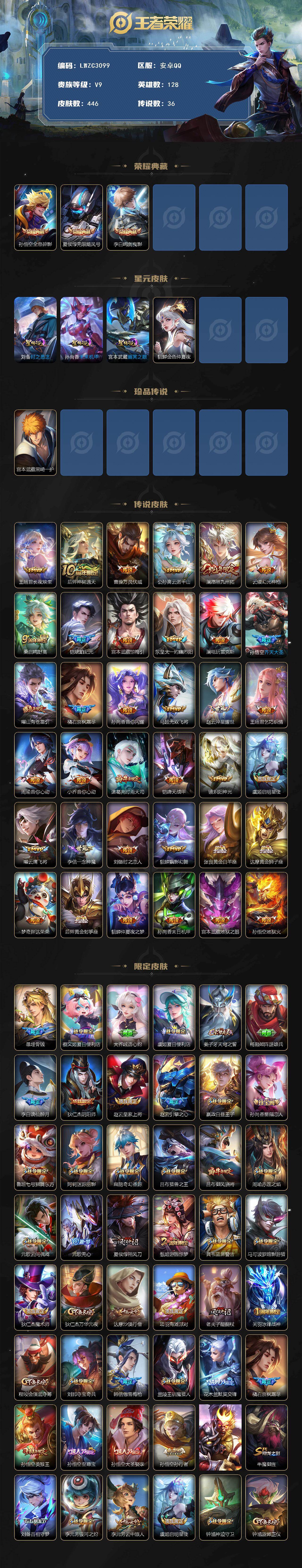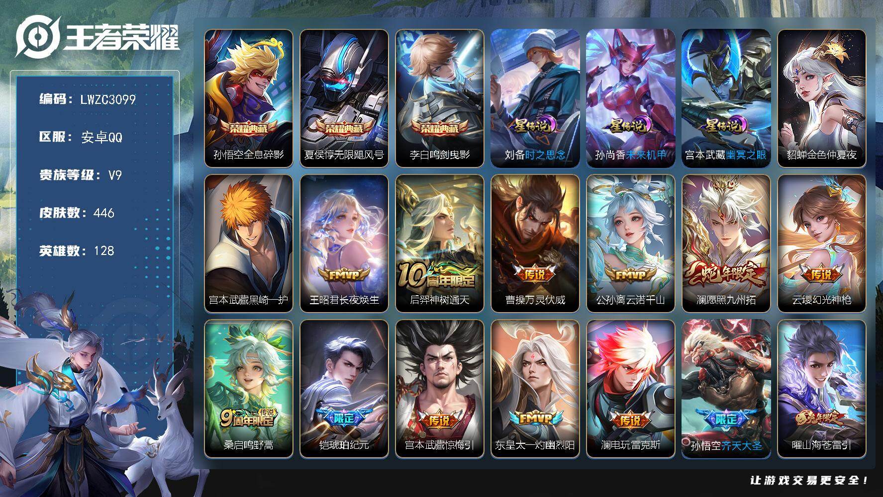 [17229538]【特价出售/店主推荐】:安卓Q-V9-尊贵铂金III段位-128英雄-446皮肤-3典藏皮肤-1珍品传说-4星元-36传说-132史诗 【英雄全皮】:刘禅全皮,宫本武藏全皮,刘邦全皮,孙权全皮,橘右京全皮,刘备全皮,鬼谷子全皮,敖隐全皮,金蝉全皮,戈娅全皮,空空儿全皮,影全皮 【荣耀典藏】:孙悟空全息碎影,夏侯惇无限飓风号,李白鸣剑曳影 【珍品传说】:宫本武藏黑崎一护 【传说皮肤】:王昭君长夜焕生,后羿神树通天,曹操万灵伏威,公孙离云诺千山,澜愿照九州拓,云缨幻光神枪,桑启鸣野蒿,铠琥珀纪元,宫本武藏惊梅引,东皇太一灼幽烈阳,澜电玩雷克斯,孙悟空齐天大圣,曜山海苍雷引,橘右京枫霜尽,孙尚香音你闪耀,马超无双飞将,赵云淬星耀世,王昭君乞巧织情,周瑜音你心动,小乔音你心动,诸葛亮时雨天司,铠绛天战甲,镜炽阳神光,虞姬启明星使,曜云鹰飞将,李信一念神魔,刘备时之恋人,貂蝉猫影幻舞,张良黄金白羊座,达摩黄金狮子座,梦奇胖达荣荣,后羿黄金射手座,貂蝉仲夏夜之梦,孙尚香末日机甲,宫本武藏地狱之眼,孙悟空地狱火 【限定皮肤】:暃埋骨钱,蔡文姬夏日便利店,大乔绒语心约,虞姬夏日便利店,姜子牙天穹之誓,杨戬破阵退雄兵,李白谪仙醉月,狄仁杰阴阳师,赵云皇家上将,赵云引擎之心,嬴政白昼王子,孙尚香蔷薇恋人,鲁班七号狮舞东方,阿轲迷踪丽影,扁鹊奇幻香踪,吕布猎兽之王,吕布御风骁将,周瑜赤莲之焰,元歌云间偶戏,元歌无心,夏侯惇朔风刀,甄姬游园惊梦,典韦蓝屏警告,马可波罗暗影游猎,狄仁杰魔术师,狄仁杰万华元夜,达摩沙漠行僧,项羽海滩派对,老夫子醍醐杖,关羽冰锋战神,程咬金演武夺筹,刘邦夺宝奇兵,韩信傲雪梅枪,兰陵王驯魔猎人,花木兰默契交锋,橘右京枫霜尽,孙悟空美猴王,孙悟空至尊宝,孙悟空大圣娶亲,孙悟空孙行者,孙悟空齐天大圣,牛魔御旌,刘备百相守梦,李元芳银河之约,李元芳云中旅人,虞姬启明星使,钟馗神迹守卫,钟馗驱傩正仪,杨戬潮玩骑兵,女娲朔望之晖,干将莫邪胡桃夹子,雅典娜单词大作战,鬼谷子原初探秘者,鬼谷子五谷丰年,诸葛亮时雨天司,铠青龙志,苏烈千军破阵,百里守约朱雀志,弈星混沌棋,沈梦溪星空之诺,明世隐疑决卦,裴擒虎天狼狩猎者,裴擒虎李小龙,裴擒虎擒涛扼浪,米莱狄胡桃异想国,云中君纤云弄巧,盾山御銮,上官婉儿梁祝,嫦娥拒霜思,嫦娥暖冬兔眠,曜山海苍雷引,西施玲珑珍味,蒙犽狂想玩偶喵,鲁班