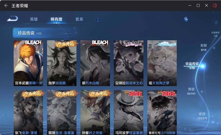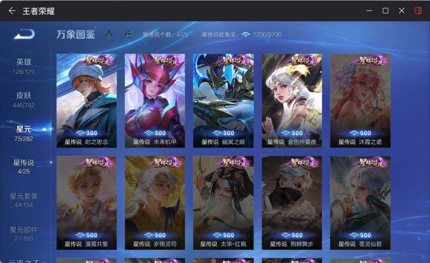 牛魔御旌,盾山御銮,夏侯惇朔风刀,明世隐疑决卦,老夫子醍醐杖,鬼谷子原初探秘者,狄仁杰万华元夜,程咬金演武夺筹,钟馗驱傩正仪,苏烈千军破阵,吕布猎兽之王,嬴政白昼王子,女娲朔望之晖,典韦蓝屏警告,钟馗神迹守卫,鲁班七号狮舞东方,沈梦溪星空之诺,李元芳银河之约,刘邦夺宝奇兵,马可波罗暗影游猎,蒙犽狂想玩偶喵,元歌云间偶戏,弈星混沌棋,达摩沙漠行僧,李元芳云中旅人,桑启海盐诗旅,裴擒虎擒涛扼浪,鲁班大师探海日志,张良古海寻踪,项羽苍威无极,镜青焰无极