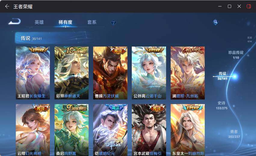 【传说皮肤】:王昭君长夜焕生,后羿神树通天,曹操万灵伏威,公孙离云诺千山,澜愿照九州拓,云缨幻光神枪,桑启鸣野蒿,铠琥珀纪元,宫本武藏惊梅引,东皇太一灼幽烈阳,澜电玩雷克斯,孙悟空齐天大圣,曜山海苍雷引,橘右京枫霜尽,孙尚香音你闪耀,马超无双飞将,赵云淬星耀世,王昭君乞巧织情,周瑜音你心动,小乔音你心动,诸葛亮时雨天司,铠绛天战甲,镜炽阳神光,虞姬启明星使,曜云鹰飞将,李信一念神魔,刘备时之恋人,貂蝉猫影幻舞,张良黄金白羊座,达摩黄金狮子座,梦奇胖达荣荣,后羿黄金射手座,貂蝉仲夏夜之梦,孙尚香末日机甲,宫本武藏地狱之眼,孙悟空地狱火