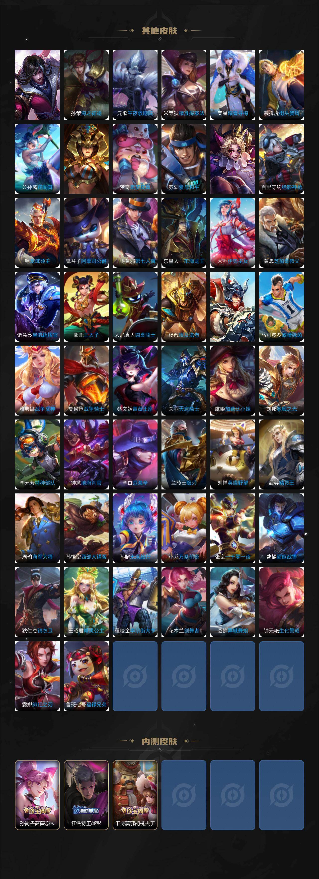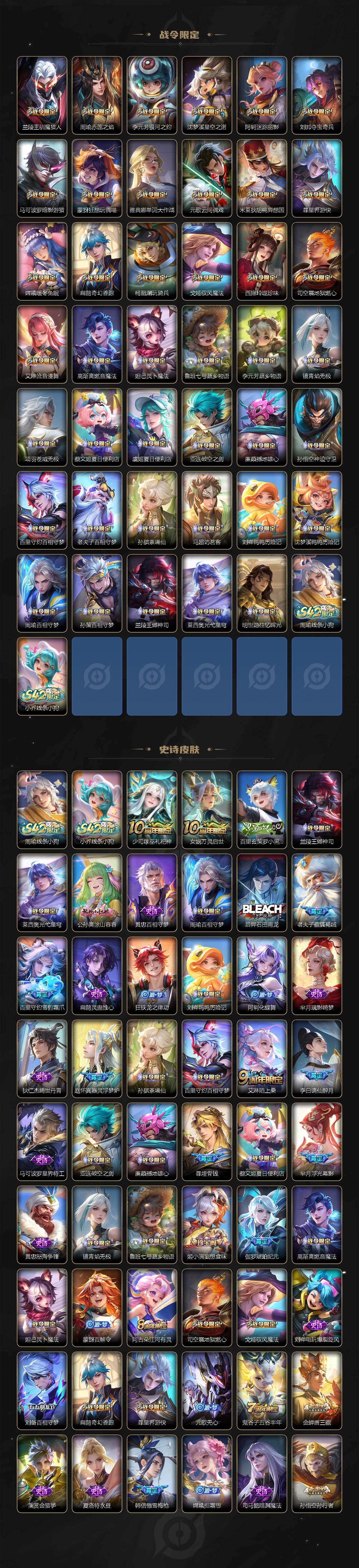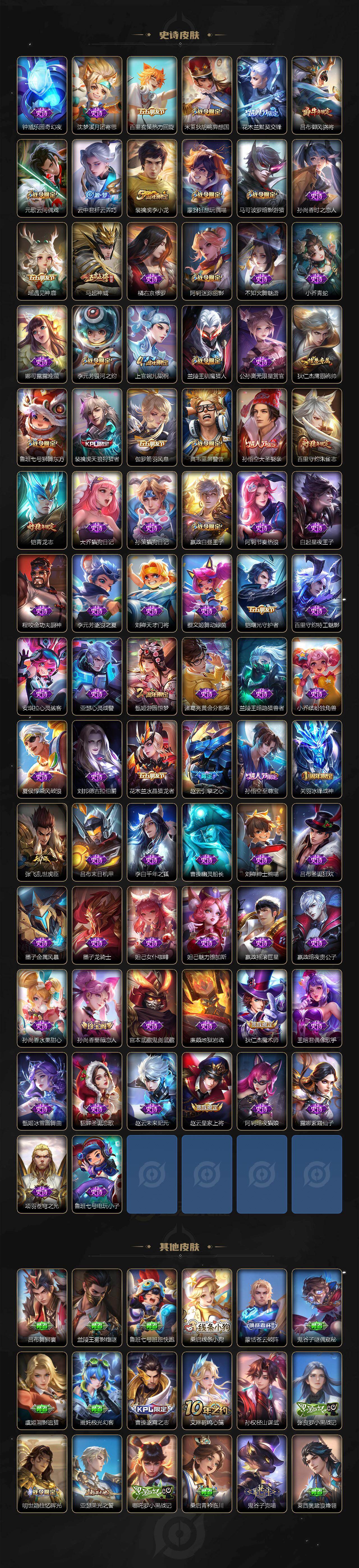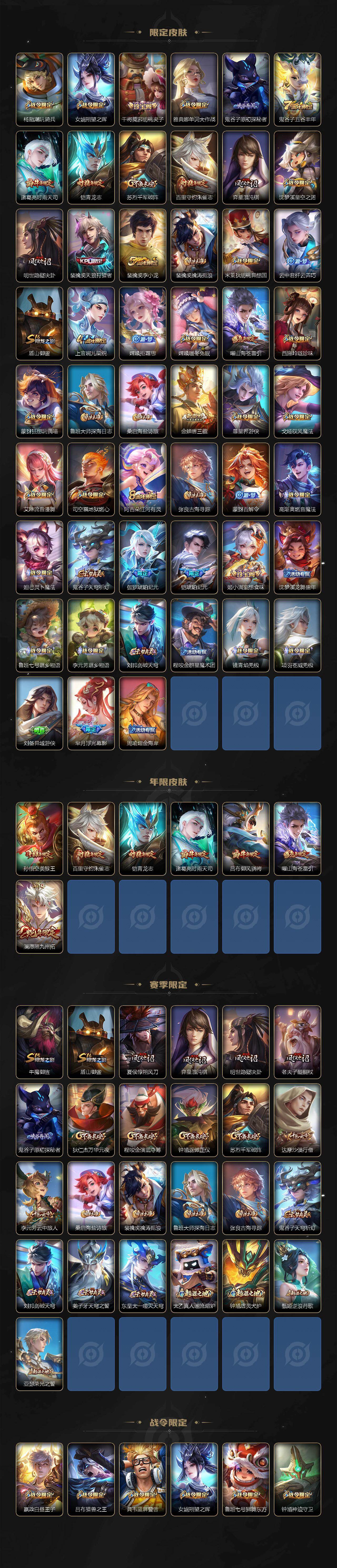 【限定皮肤】:暃埋骨钱,蔡文姬夏日便利店,大乔绒语心约,虞姬夏日便利店,姜子牙天穹之誓,杨戬破阵退雄兵,李白谪仙醉月,狄仁杰阴阳师,赵云皇家上将,赵云引擎之心,嬴政白昼王子,孙尚香蔷薇恋人,鲁班七号狮舞东方,阿轲迷踪丽影,扁鹊奇幻香踪,吕布猎兽之王,吕布御风骁将,周瑜赤莲之焰,元歌云间偶戏,元歌无心,夏侯惇朔风刀,甄姬游园惊梦,典韦蓝屏警告,马可波罗暗影游猎,狄仁杰魔术师,狄仁杰万华元夜,达摩沙漠行僧,项羽海滩派对,老夫子醍醐杖,关羽冰锋战神,程咬金演武夺筹,刘邦夺宝奇兵,韩信傲雪梅枪,兰陵王驯魔猎人,花木兰默契交锋,橘右京枫霜尽,孙悟空美猴王,孙悟空至尊宝,孙悟空大圣娶亲,孙悟空孙行者,孙悟空齐天大圣,牛魔御旌,刘备百相守梦,李元芳银河之约,李元芳云中旅人,虞姬启明星使,钟馗神迹守卫,钟馗驱傩正仪,杨戬潮玩骑兵,女娲朔望之晖,干将莫邪胡桃夹子,雅典娜单词大作战,鬼谷子原初探秘者,鬼谷子五谷丰年,诸葛亮时雨天司,铠青龙志,苏烈千军破阵,百里守约朱雀志,弈星混沌棋,沈梦溪星空之诺,明世隐疑决卦,裴擒虎天狼狩猎者,裴擒虎李小龙,裴擒虎擒涛扼浪,米莱狄胡桃异想国,云中君纤云弄巧,盾山御銮,上官婉儿梁祝,嫦娥拒霜思,嫦娥暖冬兔眠,曜山海苍雷引,西施玲珑珍味,蒙犽狂想玩偶喵,鲁班