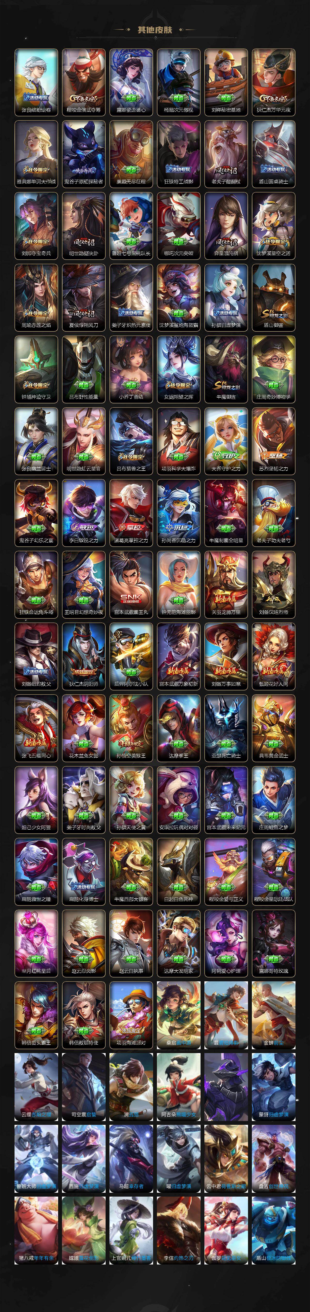 小乔青蛇,瑶遇见神鹿,娜可露露晚萤,伽罗箭羽风息,李元芳逐浪之夏,不知火舞魅语,公孙离无限星赏官,大乔猫狗日记,孙策猫狗日记,阿轲节奏热浪,露娜紫霞仙子,诸葛亮黄金分割率,王昭君偶像歌手,项羽苍穹之光,孙尚香时之恋人,阿轲暗夜猫娘,吕布末日机甲,鲁班七号电玩小子,橘右京修罗,墨子龙骑士,嬴政摇滚巨星,刘禅绅士熊喵,刘禅天才门将,白起星夜王子,安琪拉心灵骇客,程咬金功夫厨神,刘邦德古拉伯爵,兰陵王暗隐猎兽者,曹操幽灵船长,宫本武藏鬼剑武藏,司马懿暗渊魔法,亚瑟心灵战警,钟馗乐园奇幻夜,蔡文姬舞动绿茵,廉颇地狱岩魂,小乔缤纷独角兽,夏侯惇乘风破浪,花木兰水晶猎龙者,铠曙光守护者,百里玄策热力回旋,墨子金属风暴,吕布圣诞狂欢,貂蝉圣诞恋歌,百里守约特工魅影,嬴政暗夜贵公子,嫦娥拒霜思,李白千年之狐,夏洛特永昼,澜赏金猎手,刘备百相守梦,刘禅电玩·爆裂旋风,蒙犽百解令,高渐离燃音魔法,伽罗琥珀纪元,李白谪仙醉月,赵怀真器灵·浮梦炉,狄仁杰绮世丹青