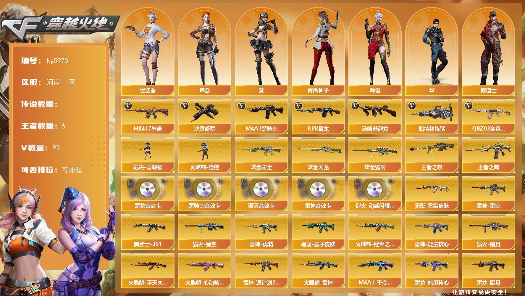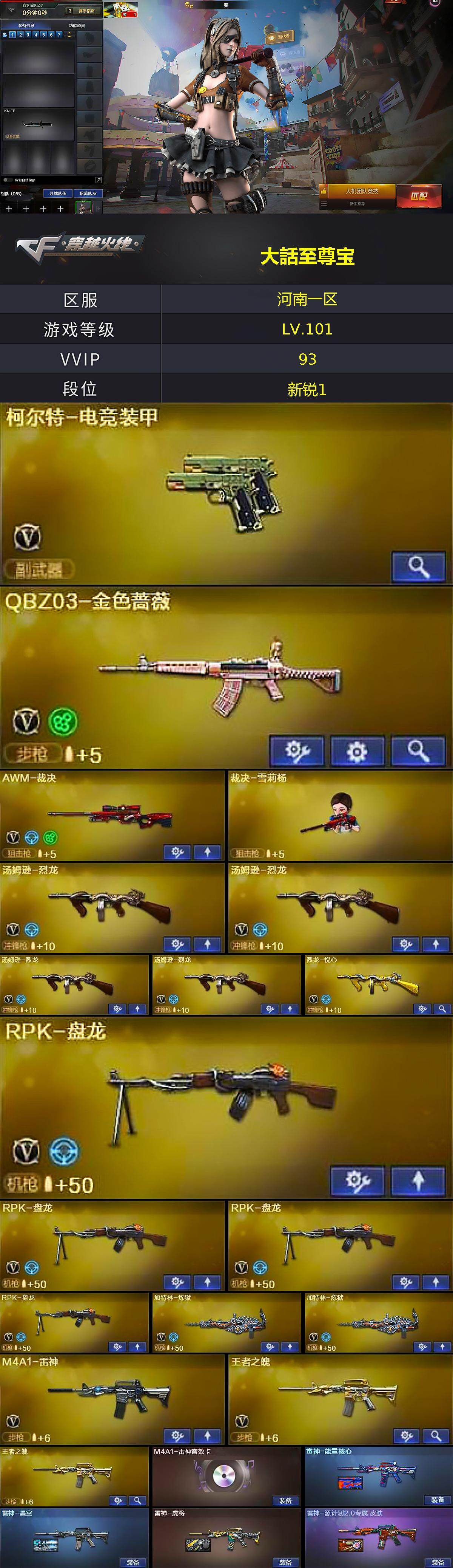 [17229560]河南一区-97V-6王者武器数-5炫金武器数 【热门武器】:QBZ03-金色蔷薇,HK417-朱雀,M4A1-黑骑士,汤姆逊-烈龙*4,RPK-盘龙*4,加特林-炼狱*2,裁决-雪莉杨,火麒麟-绝迹,沙鹰-修罗*3 【王者炫金武器】:王者之魄,王者之怒,炫金骑士*3,炫金毁灭,炫金天龙 【音效卡】:烈火-动感闪耀 音效卡,M4A1-雷神音效卡,M4A1-黑龙音效卡,M4A1-黑骑士音效卡,Barrett-毁灭音效卡 【皮肤】:雷神-能量核心,雷神-星空,雷神-虎将,雷神-源计划2.0专属 皮肤,火麒麟-雷神,火麒麟-冠军之心,火麒麟-平天大圣,火麒麟-心动糖果,毁灭-暗月,毁灭-星空,M4A1-千变-孔明皮肤,黑龙-能量核心,黑龙-暗月,黑龙-墨子皮肤,无影-霓裳皮肤,AK47-黑武士-361,战神-粉色甜心皮肤*5,战神-紫绶金章皮肤*3,战神-流金岁月皮肤,修罗-能量核心*3 【角色】:葵,魅影,迷迭香,华,修道士,电竞少女,飞虎队-X,风暴女,嘉年华灵狐,娟娟,灵狐者-黄金海岸,麻雀,玫瑰花神,潘多拉-X,潜龙队-X,青霞仙子,斯沃特-X,蜀雪,铁骑-乘风破浪,兔囡囡,新娜塔莎,樱-缤纷夏日,影武者-X,游珑儿 【人偶武器】:火麒麟-绝迹,裁决-雪莉杨,火麒麟-灵狐,巴雷特-零-水下丽影,AWM-灵狐-15周年嘉年华,迷你深渊冰龙*2,迷你牛魔王,迷你波特博士,夺魂,迷你牛牛*3,迷你生化手雷,生化手雷-机甲核心,深渊终结者手雷*3,闪光弹-小乔,迷你巨石泰坦-魔花研究所 【挑战大师】:神圣爆裂者III,冰龙粉碎者-白马银枪,激光毁灭者III-白马银枪*2,激光毁灭者III,试炼破坏者III,KAC-圣炎切割者III,神圣爆裂者-末日III 【英雄级武器】:AK47-火麒麟*2,M4A1-黑龙,M4A1-雷神,M4A1-黑骑士,AK47-无影,AK12-天启,M4A1-武圣,AK47-黑鲨,M4A1-龙血,HK417-朱雀,无影-神兵利器,黑武士-锦绣游龙,QBZ03-金色蔷薇,9A91-烈火*3,王者之心-觉醒版,王者之魄-觉醒版,王者之势-觉醒版,AK-47-猩红传说*9,AK47-B-战神,AWM-天龙*3,Barrett-毁灭,AWM-裁决,Barrett-金色蔷薇,RPK-盘龙*4,加特林-炼狱*2,汤姆逊-烈龙*4,烈龙-悦心-觉醒版,AA-12