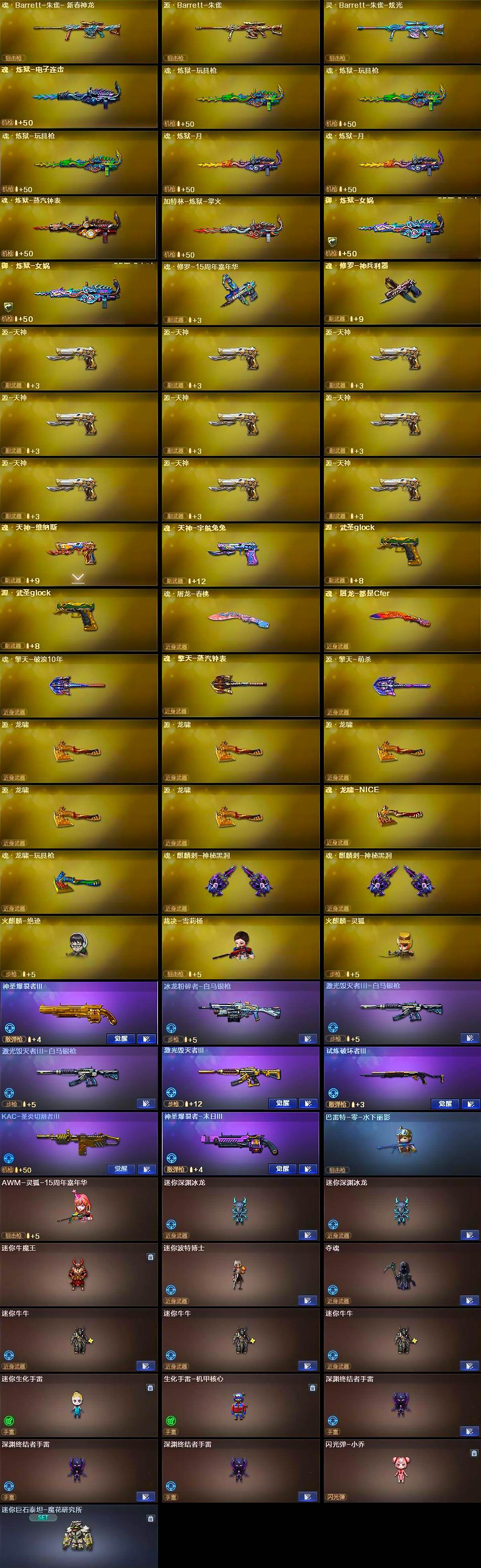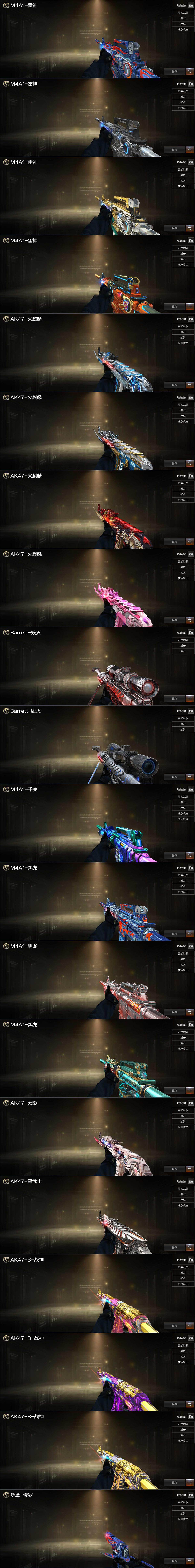 【英雄级武器】:AK47-火麒麟*2,M4A1-黑龙,M4A1-雷神,M4A1-黑骑士,AK47-无影,AK12-天启,M4A1-武圣,AK47-黑鲨,M4A1-龙血,HK417-朱雀,无影-神兵利器,黑武士-锦绣游龙,QBZ03-金色蔷薇,9A91-烈火*3,王者之心-觉醒版,王者之魄-觉醒版,王者之势-觉醒版,AK-47-猩红传说*9,AK47-B-战神,AWM-天龙*3,Barrett-毁灭,AWM-裁决,Barrett-金色蔷薇,RPK-盘龙*4,加特林-炼狱*2,汤姆逊-烈龙*4,烈龙-悦心-觉醒版,AA-12