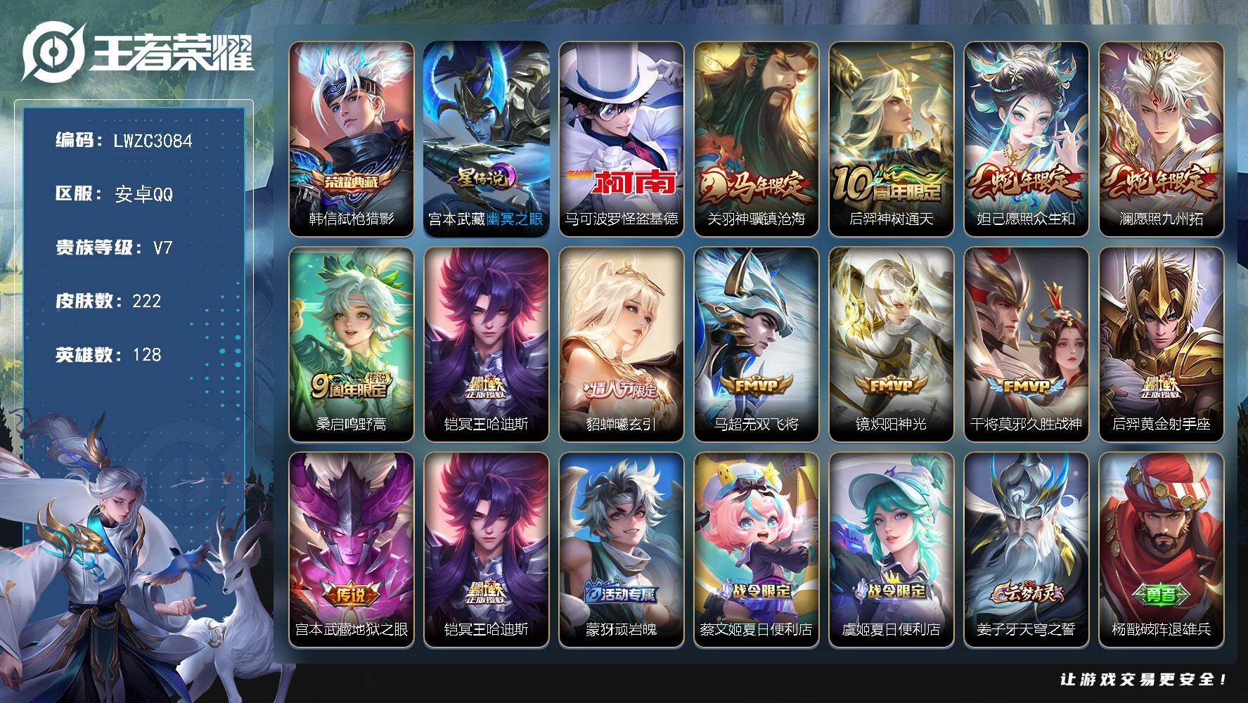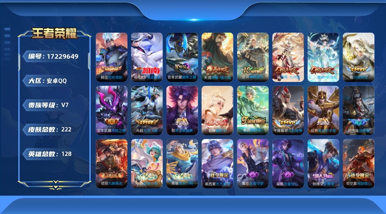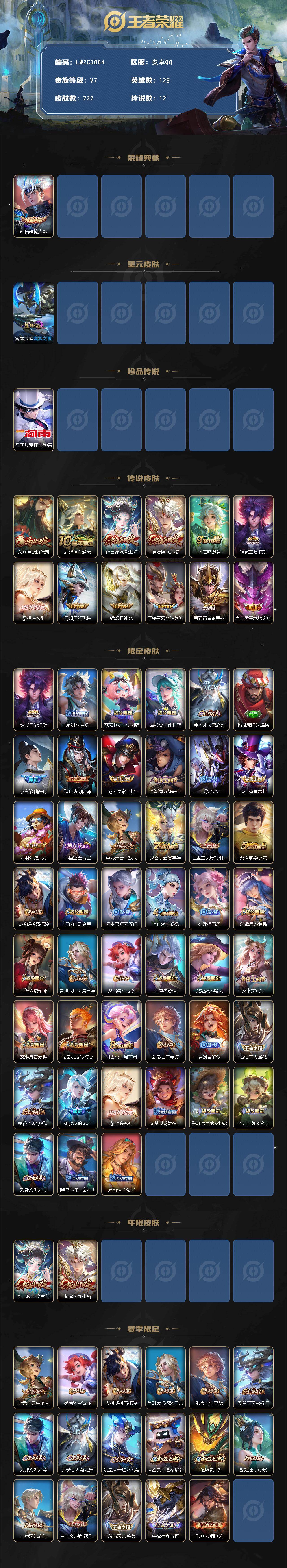 [17229649]可二次【特价出售/店主推荐】安卓Q-V7-最强王者段位-128英雄-222皮肤-1典藏皮肤-1珍品传说-1星传说-12传说-64史诗