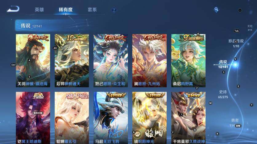 【传说皮肤】:关羽神骥镇沧海,后羿神树通天,妲己愿照众生和,澜愿照九州拓,桑启鸣野蒿,铠冥王哈迪斯,貂蝉曦玄引,马超无双飞将,镜炽阳神光,干将莫邪久胜战神,后羿黄金射手座,宫本武藏地狱之眼