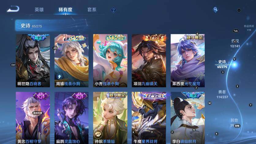 【史诗皮肤】:明世隐百晓客,周瑜线条小狗,小乔线条小狗,项羽九幽镇关,莱西奥光弋星穹,黄忠百相守梦,扁鹊灵蛊蚀心,孙膑茶境仙,牛魔星界战将,李白谪仙醉月,亚连破空之剑,蒙犽顽岩魄,蔡文姬夏日便利店,鲁班七号蔬乡物语,伽罗琥珀纪元,蒙恬荣光圣徽,蒙犽百解令,阿古朵江河有灵,司空震地狱燃心,戈娅驭风魔
