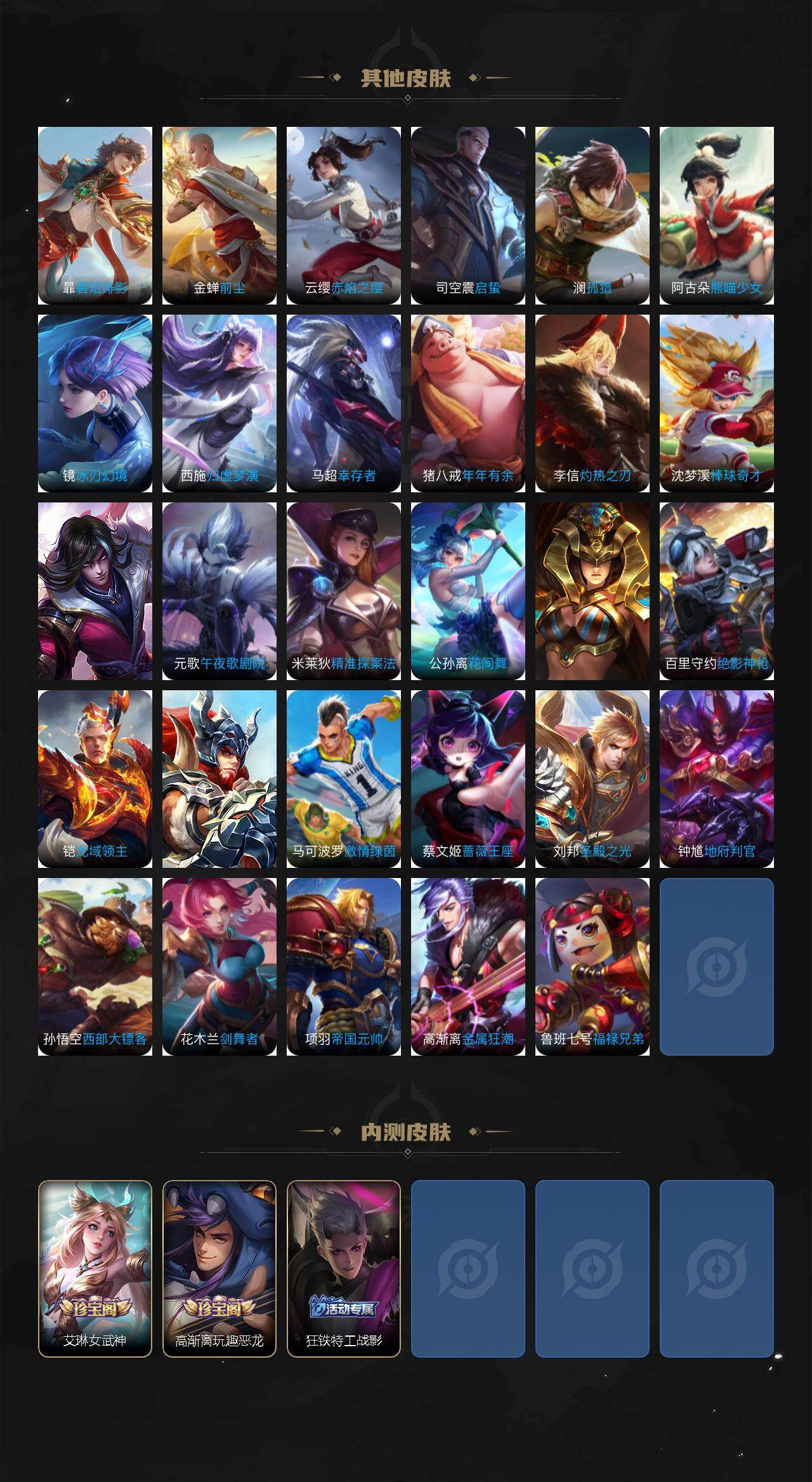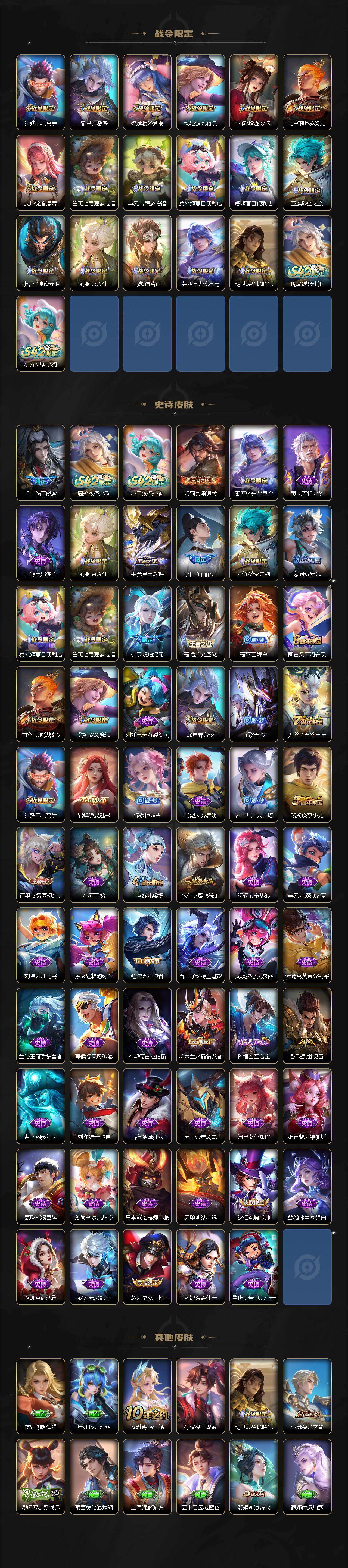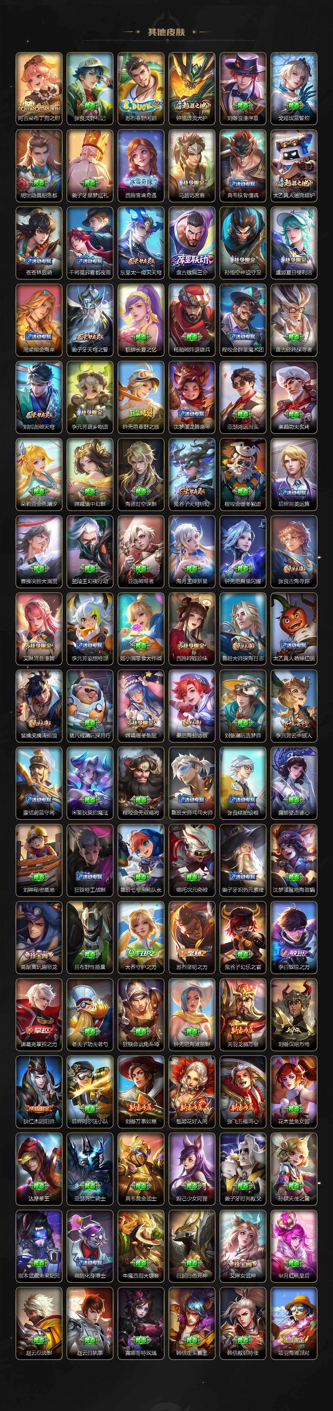 【限定皮肤】:铠冥王哈迪斯,蒙犽顽岩魄,蔡文姬夏日便利店,虞姬夏日便利店,姜子牙天穹之誓,杨戬破阵退雄兵,李白谪仙醉月,狄仁杰阴阳师,赵云皇家上将,高渐离玩趣恶龙,元歌无心,狄仁杰魔术师,项羽海滩派对,孙悟空至尊宝,李元芳云中旅人,鬼谷子五谷丰年,百里玄策原初追逐者,裴擒虎李小龙,裴擒虎擒涛扼浪,狂铁电玩高手,云中君纤云弄巧,上官婉儿梁祝,嫦娥拒霜思,嫦娥暖冬兔眠,西施玲珑珍味,鲁班大师探海日志,桑启海盐诗旅,暃星界游侠,戈娅驭风魔法,艾琳女武神,艾琳流音漫舞,司空震地狱燃心,阿古朵江河有灵,张良古海寻踪,蒙犽百解令,蒙恬荣光圣徽,鬼谷子天穹祈灯,伽罗琥珀纪元,貂蝉曦玄引,沈梦溪龙舞盛年,鲁班七号蔬乡物语,李元芳蔬乡物语,刘邦剑破天穹,程咬金群星魔术团,周瑜熔金海岸