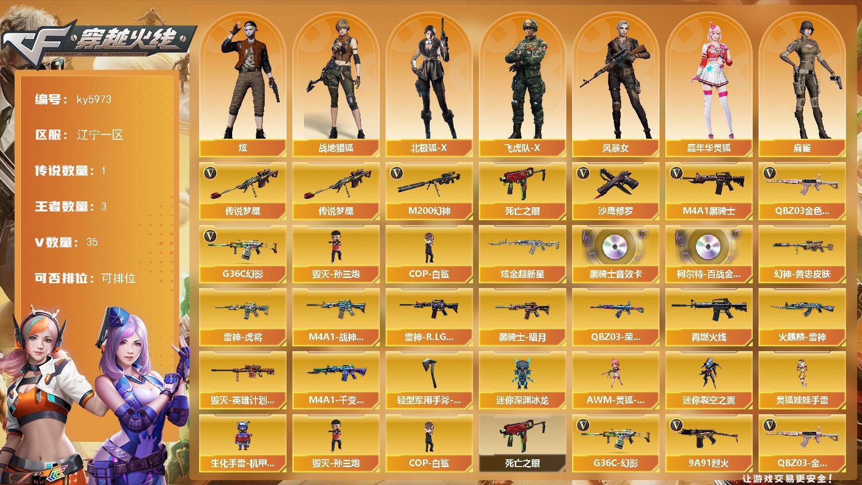 - [15247833]广西一区-39V-7王者-0炫金 【传说武器】:传说圣灵 【热门武器】:传说圣灵,QBZ03-金色蔷薇,M200-幻神,QBZ03-街机,沙鹰-修罗*5 【皮肤】:幻神-电竞之星 皮肤,QBZ03-荣耀世冠EP 皮肤,雷神-传奇N9,雷神-烈虎皮肤,雷神-荣耀世冠AG,雷神-源计划2.0专属 皮肤,火麒麟-AG战队皮肤,火麒麟-百城,火麒麟-心动糖果,毁灭耀金皮肤,毁灭-黑大圣皮肤,毁灭-黑曼巴 皮肤,战神-紫绶金章皮肤,战神-流金岁月皮肤,AK47-B-常胜将军-曹操,AK47-B-常胜将军-刘备,AK47-B-常胜将军-孙权 【角色】:审判者,妮妮,王者-迷迭香,王者潘多拉,乔伊教练,暗夜-X,飞虎队-X,风暴女,虎妞,嘉年华灵狐,兰妹妹,猎狐者-追月,0号玩家,灵动武士,灵狐者-X,灵狐者-黄金海岸,灵狐者-七夕宝贝,流浪蔷薇,龙儿-小淘气,萌儿,潘多拉-X,潘多拉-甜心教官,斯沃特-X,蜀雪,兔囡囡,雪莉杨,夜玫瑰-幻能朋克,游珑儿 【人偶武器】:AWM-灵狐-15周年嘉年华,迷你波特博士,夺魂,深渊终结者手雷,闪光弹-貂蝉,AK47-斯沃特,Barrett-夜玫瑰,灵狐娃娃手雷 【暴走生化】:黑龙吞噬者,超级对讲机 【挑战大师】:神圣爆裂者-末日III 【英雄级武器】:AK47-火麒麟*2,M4A1-雷神,M4A1-龙血,无影-神兵利器,黑武士-锦绣游龙,QBZ03-金色蔷薇,AK-47-猩红传说,AK47-B-常胜将军,AWM-天龙,Barrett-毁灭,M200-幻神,Barrett-金色蔷薇,沙鹰-修罗*5,屠龙,龙啸,麒麟刺*2,幻灵之锋,王者之击-觉醒版*2,高爆手雷-竞技荣光,手雷-动感闪耀,闪光弹-幻灵,闪光弹-竞技荣光,闪光弹-雷霆王者-觉醒版,烟雾弹-幻灵*3,烟雾弹-竞技荣光,M4A1-赤狱骑士 【道具】:CFS限定背包,亚洲杯纪念炫彩背包,超级背包,绿色巨人,灵魂忍者,变异宝贝,迷雾幽灵,夺命之镰,防化服*2,金色流光-枪王排位,枪王排位28赛季金色流光,语音特效-机器人,EP战队击杀图标*2,C4-红龙,防弹头盔*4,防弹衣*4,C4工具钳*4,手雷包*4 【特殊枪械】: