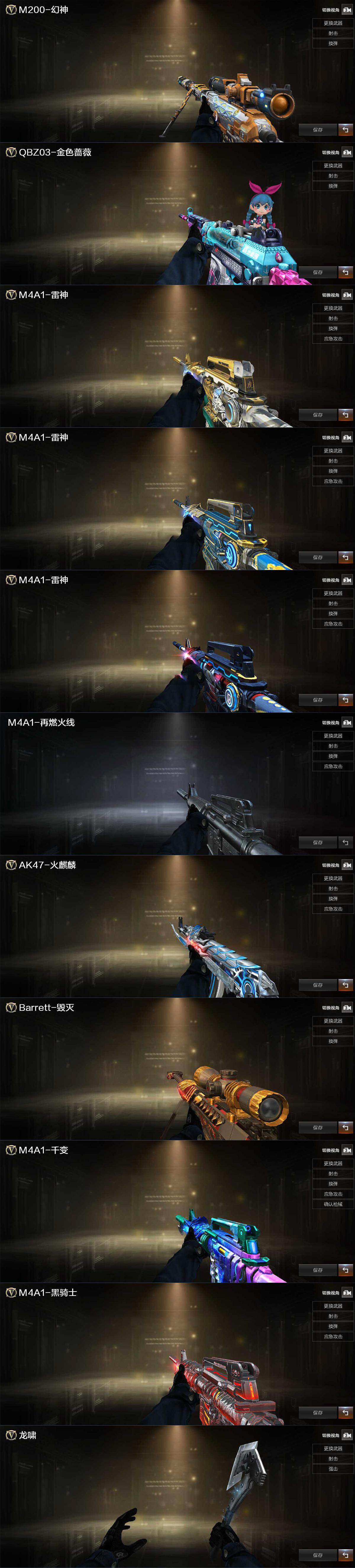 【皮肤】:M200-幻神-黄忠皮肤,QBZ03-荣耀世冠白鲨,雷神-虎将,M4A1-战神赵云,雷神-R.LGD-CFPLS18冠军,M4A1-再燃火线,火麒麟-雷神,毁灭-英雄计划 皮肤,M4A1-千变-孔明皮肤,黑骑士-暗月,轻型军用手斧-再燃火线
