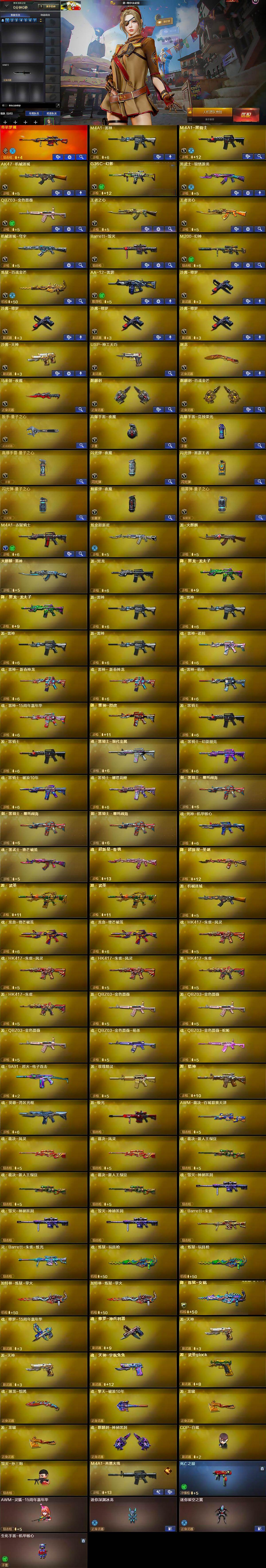 【热门武器】:传说梦魇,G36C-幻影,QBZ03-金色蔷薇,M200-幻神,死亡之眼,M4A1-黑骑士,毁灭-孙三炮,COP-白鲨,沙鹰-修罗*4