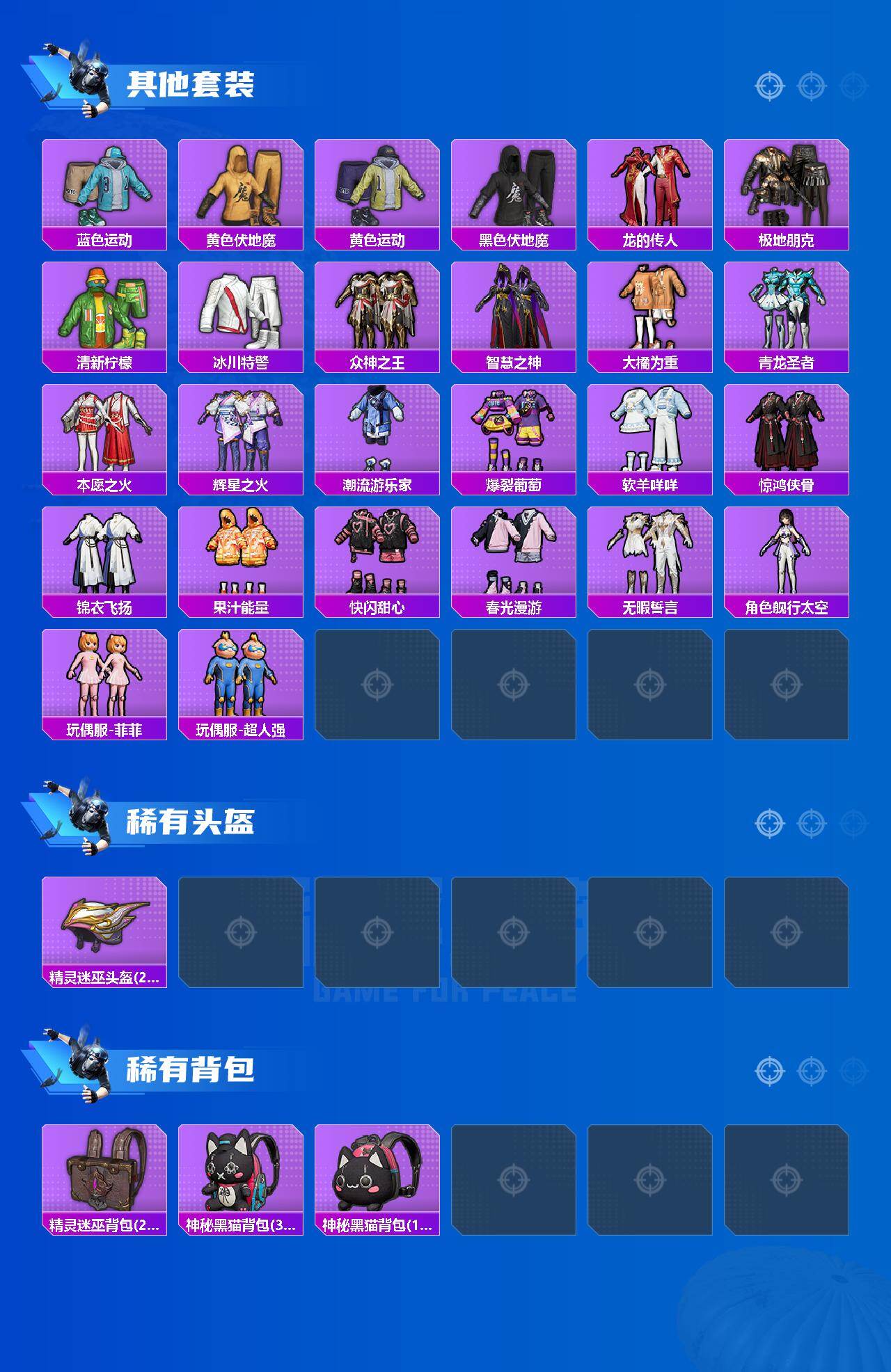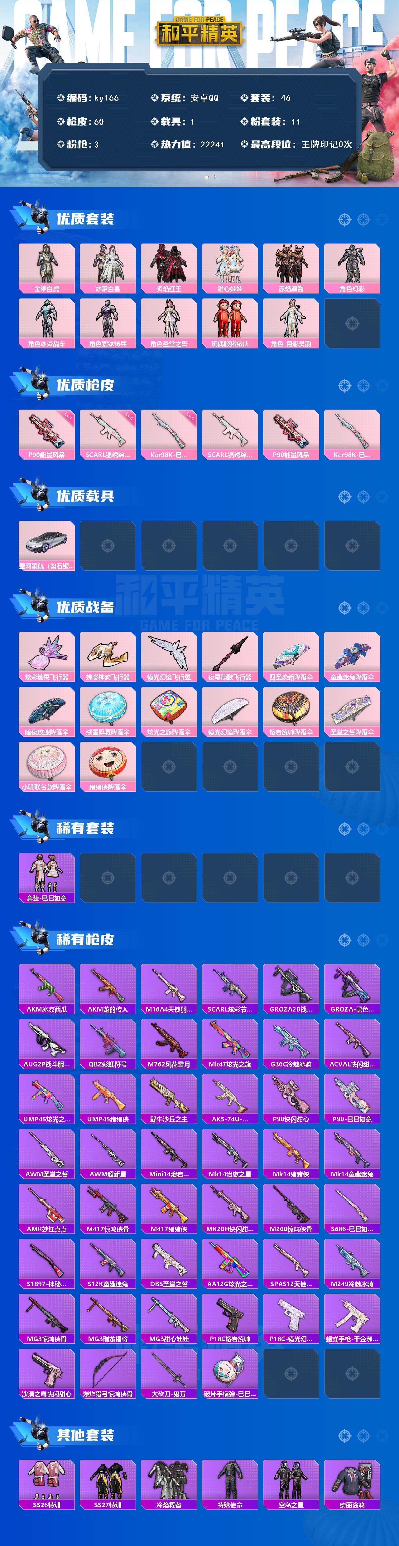 [17229961]安卓 手Q-11粉装-3特效枪-1载具-4粉色飞行器-22241热力值-2王牌印记-46套装-60枪皮 【粉色套装】:粉装-金曜白虎,粉装-冰霜白皇,粉装-炙焰红王,粉装-甜心娃娃,粉装-赤焰黑爵,角色-幻影,角色-冰炎战车,角色-紫钛骑兵,角色-圣堂之誓,玩偶服-猪猪侠,角色-月影灵韵 【粉色枪皮等级】:SCAR-L-锦绣绵绵(五级),P90-能量风暴(七级),Kar98K-巳巳如意(四级) 【粉色载具】:星河领航(磐石银) 【粉色枪皮】:SCAR-L-锦绣绵绵,P90-能量风暴,Kar98K-巳巳如意 【粉色飞行器】:炫彩糖果飞行器,拂晓神骑飞行器,镜光幻境飞行翼,夜幕颂歌飞行器 【粉色降落伞】:四圣焕新降落伞,童趣迷兔降落伞,暗夜玫瑰降落伞,绒雪飘舞降落伞,炫光之旅降落伞,镜光幻境降落伞,熔岩统帅降落伞,圣堂之誓降落伞,小叽联名款降落伞,猪猪侠降落伞 【稀有套装】:套装-巳巳如意 【稀有枪皮】:AKM-冰凉西瓜,AKM-龙的传人,M16A4-天使羽翼,SCAR-L-炫彩节奏,GROZA-2B战斗服款,GROZA-黑色刀锋,AUG-2P战斗服款,QBZ-彩虹符号,M762-风花雪月,Mk47-炫光之旅,G36C-冷魅冰骑,AC-VAL-快闪甜心,UMP45-炫光之旅,UMP45-猪猪侠,野牛-沙丘之主,AKS-74U-鬼刀,P90-快闪甜心,P90-巳巳如意,AWM-圣堂之誓,AWM-超新星,Mini14-熔岩统帅,Mk14-治愈之星,Mk14-猪猪侠,Mk14-童趣迷兔,AMR-妙红点点,M417-惊鸿侠骨,M417-猪猪侠,MK20-H-快闪甜心,M200-惊鸿侠骨,S686-巳巳如意,S1897-神秘黑猫,S12K-童趣迷兔,DBS-圣堂之誓,AA12-G-炫光之旅,SPAS-12-天使羽翼,M249-冷魅冰骑,MG3-惊鸿侠骨,MG3-瑞龙福将,MG3-甜心娃娃,P18C-熔岩统帅,P18C-镜光幻境,蝎式手枪-千金淑猫,沙漠之鹰-快闪甜心,爆炸猎弓-惊鸿侠骨,大砍刀-鬼刀,破片手榴弹-巳巳如意 【其他套装】:套装-SS26特训,套装-SS27特训,套装-冷焰舞者,套装-特殊使命,套装-空岛之星,套装-绮丽涂鸦,套装-蓝色运动,套装-黄色伏地魔,套装-黄色运动,套装-黑色伏地魔,套装-龙的传人,套装-极地朋克,套装-清新柠檬,套装-冰川特警,套装-众神