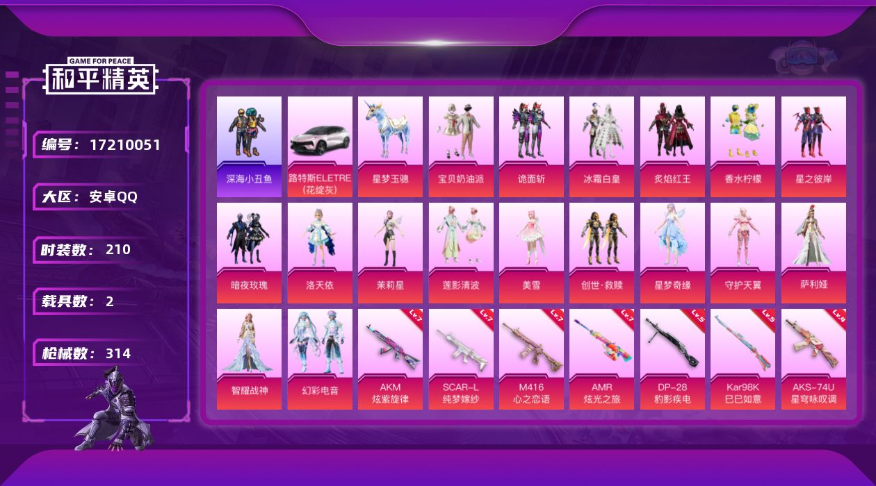 [17210051]安卓 手Q-17粉装-13特效枪-2载具-12粉色飞行器-106298热力值-16王牌印记-210套装-314枪皮 【热门品类】:套装-浪漫天命,套装-深海小丑鱼,套装-龟仙人,角色-8号机,角色-Mark.06,大砍刀-青龙偃月刀,撬棍-龙胆亮银枪 【粉色套装】:粉装-宝贝奶油派,粉装-诡面斩,粉装-冰霜白皇,粉装-炙焰红王,粉装-香水柠檬,粉装-星之彼岸,粉装-暗夜玫瑰,角色-洛天依,角色-茉莉星,粉装-莲影清波,角色-美雪,套装-创世·救赎,角色-星梦奇缘,角色-守护天翼,角色-萨利娅,角色-智耀战神,粉装-幻彩电音 【粉色枪皮等级】:AKM-炫紫旋律(七级),SCAR-L-纯梦嫁纱(七级),M416-心之恋语(七级),M416-墨龙九天(三级),UMP45-萌骑冒险(五级),AKS-74U-星穹咏叹调(四级),Kar98K-创世·救赎(一级),Kar98K-巳巳如意(五级),Mk14-精灵梦叶罗丽(四级),Mk14-福马献瑞(一级),AMR-炫光之旅(七级),SVD-月影灵韵(四级),DP-28-豹影疾电(五级) 【粉色载具】:路特斯ELETRE(花绽灰),星梦玉骢 【粉色枪皮】:AKM-炫紫旋律,SCAR-L-纯梦嫁纱,M416-心之恋语,M416-墨龙九天,UMP45-萌骑冒险,AKS-74U-星穹咏叹调,Kar98K-创世·救赎,Kar98K-巳巳如意,Mk14-精灵梦叶罗丽,Mk14-福马献瑞,AMR-炫光之旅,SVD-月影灵韵,DP-28-豹影疾电 【粉色飞行器】:炫彩糖果飞行器,歌者泠鸢飞行器,拂晓神骑飞行器,萌物绒绒飞行器,镜光幻境飞行翼,镜域双华-灵镜之阶,绝色倾城飞行器,龙翔九天飞行器,深渊漩涡飞行器,彩虹独角兽飞行器,圣域金龙飞行器 【粉色降落伞】:春暖花开降落伞,梦幻火箭降落伞,花间之火降落伞,锦绣火鲤降落伞,荧光虫舞降落伞,童趣迷兔降落伞,香水柠檬降落伞,洛神天依降落伞,恐龙拽拽降落伞,垂柳戏鸭降落伞,第五大道降落伞,未来歌姬降落伞,莲影清波降落伞,圣堂之誓降落伞,夜幕颂歌降落伞,鎏金朋克降落伞,江南烟雨降落伞,巴啦啦小魔仙降落伞,精灵梦叶罗丽降落伞,墨龙九天降落伞,创世·救赎降落伞,星梦奇缘降落伞,守护天翼降落伞,幽焰骑士降落伞,戏水时光降落伞,百变魔方降落伞,星穹咏叹调降落伞,喜羊羊与灰太狼降落伞,极意拳锋降落伞,炫彩糖果降落伞