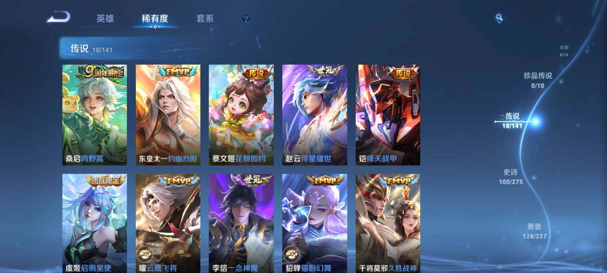 【传说皮肤】:桑启鸣野蒿,东皇太一灼幽烈阳,蔡文姬花朝如约,赵云淬星耀世,铠绛天战甲,虞姬启明星使,曜云鹰飞将,李信一念神魔,貂蝉猫影幻舞,干将莫邪久胜战神,达摩黄金狮子座,花木兰冠军飞将,后羿黄金射手座,貂蝉仲夏夜之梦,李白凤求凰,孙尚香末日机甲,宫本武藏地狱之眼,武则天海洋之心