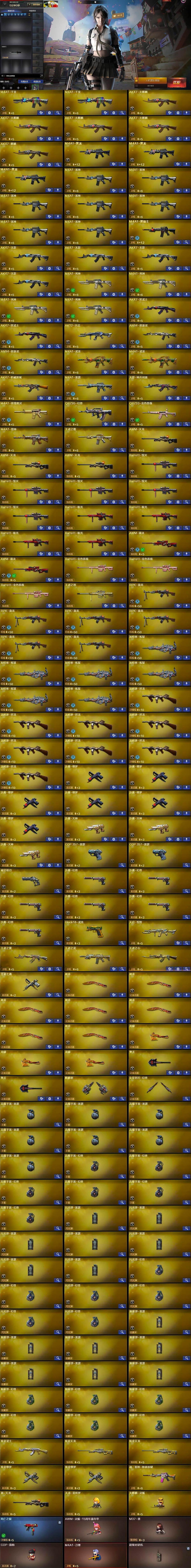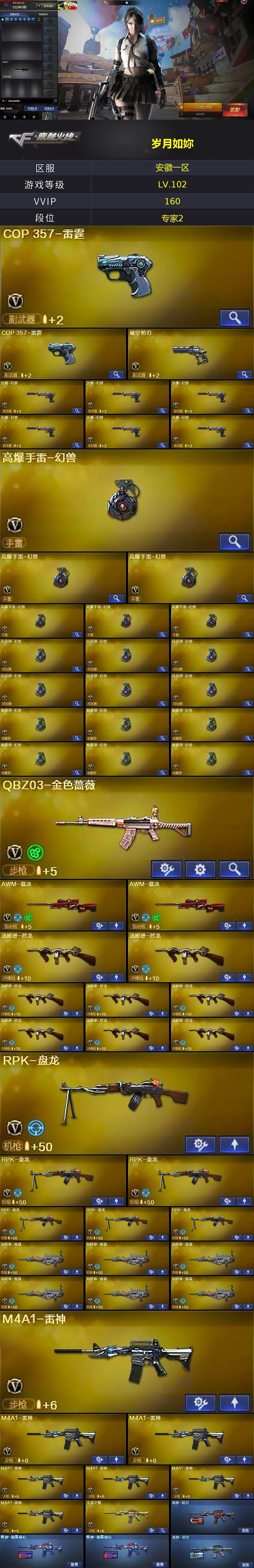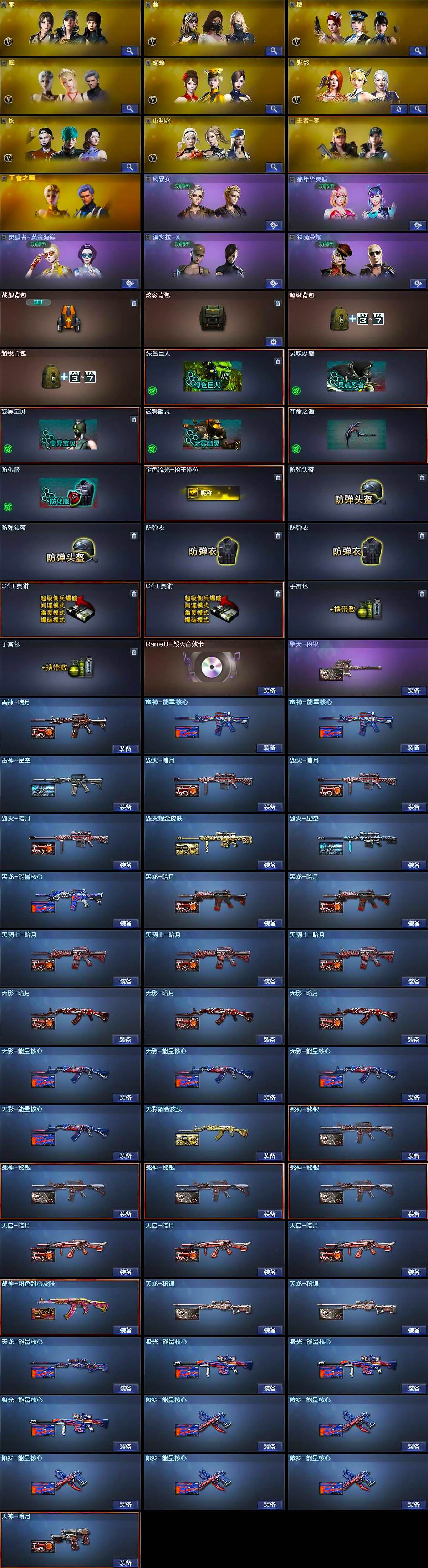 【英雄级武器】:M4A1-千变*2,AK47-火麒麟*4,AK47-麒麟,M4A1-黑龙*3,M4A1-雷神*7,M4A1-黑骑士,AK47-无影*4,M4A1-死神*4,AK47-黑武士*2,AK12-天启,AN94-超新星*2,M4A1-武圣*2,AK47-机械迷城,M4A1-雷霆,无影-神兵利器,M4A1-玫瑰精灵,QBZ95-幻兽,QBZ03-金色蔷薇,M4A1-猎神,9A91-烈火,王者之魄-觉醒版,AWM-天龙*3,Barrett-毁灭*5,Barrett-极光*4,AWM-裁决*2,Barrett-金色蔷薇*3,王者之怒-觉醒版,RPK-盘龙*6,加特林-炼狱*6,汤姆逊-烈龙*8,沙鹰-修罗*6,沙鹰-天神*3,COP-雷霆*2,破空枪刃,沙鹰-幻兽*6,Glock18-武圣,屠龙*7,龙啸*3,擎天*2,麒麟刺,女皇利刃-幻兽,高爆手雷-雷霆*7,高爆手雷-幻兽*6,闪光弹-雷霆*7,闪光弹-幻兽*6,烟雾弹-雷霆*7,烟雾弹-幻兽*6