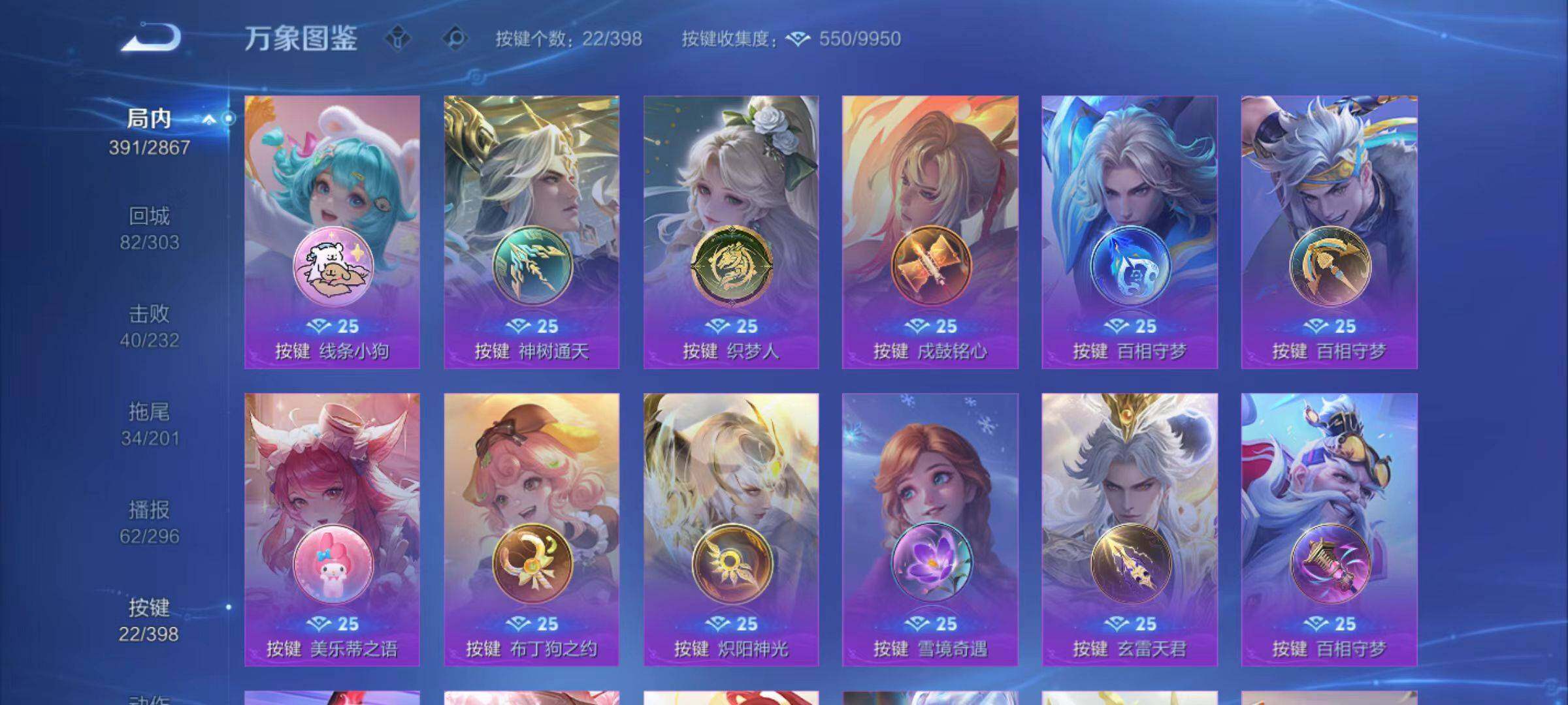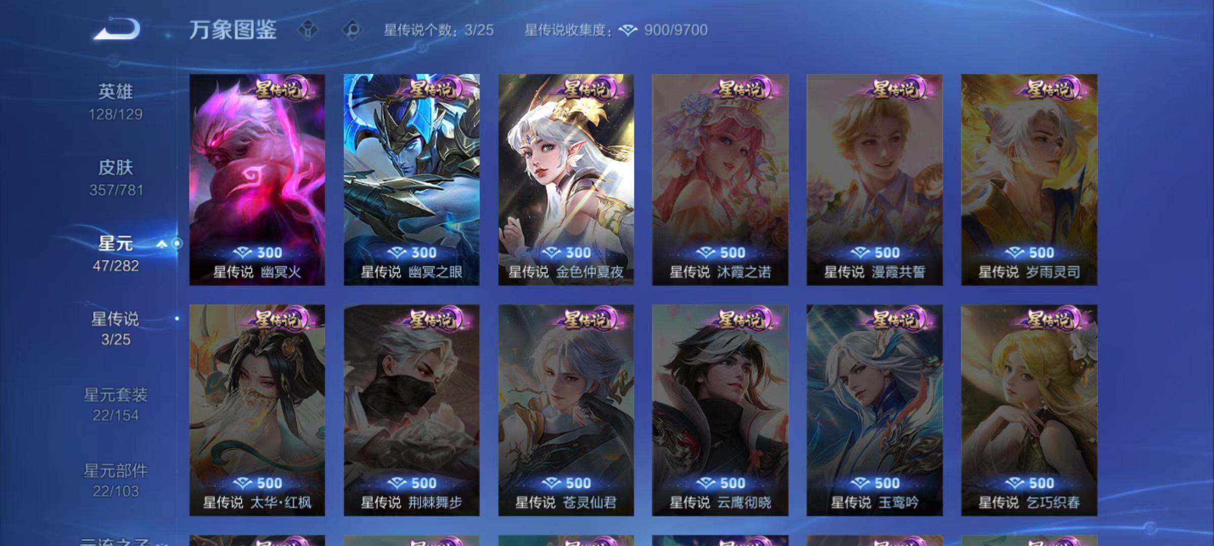 【限定皮肤】:蔡文姬夏日便利店,大乔绒语心约,虞姬夏日便利店,姜子牙天穹之誓,杨戬破阵退雄兵,狄仁杰阴阳师,赵云皇家上将,墨子降魔,妲己时之奇旅,孙尚香蔷薇恋人,庄周高山流水,钟无艳超时空战士,扁鹊奇幻香踪,吕布猎兽之王,元歌云间偶戏,元歌无心,甄姬游园惊梦,甄姬落雪兰心,狄仁杰魔术师,狄仁杰万华元夜,达摩星际陆战队,达摩沙漠行僧,项羽海滩派对,老夫子醍醐杖,安琪拉魔法小厨娘,程咬金演武夺筹,王昭君午后时光,王昭君星穹之声,兰陵王金庭之子,不知火舞绯月行,孙悟空孙行者,李元芳云中旅人,钟馗驱傩正仪,杨戬潮玩骑兵,干将莫邪胡桃夹子,雅典娜黎明之约,鬼谷子原初探秘者,鬼谷子五谷丰年,苏烈千军破阵,梦奇顽趣,沈梦溪大漠名商,裴擒虎李小龙,裴擒虎擒涛扼浪,狂铁电玩高手,云中君纤云弄巧,上官婉儿梁祝,嫦娥拒霜思,西施玲珑珍味,鲁班大师探海日志,桑启海盐诗旅,戈娅驭风魔法,艾琳流音漫舞,司空震地狱燃心,阿古朵江河有灵,张良古海寻踪,蒙犽百解令,蒙恬荣光圣徽,高渐离燃音魔法,妲己灵卜魔法,鬼谷子天穹祈灯,沈梦溪龙舞盛年,刘邦剑破天穹,程咬金群星魔术团,关羽决胜骁骑,镜青焰无极,项羽苍威无极,刘备异域游侠,芈月浮光幕影