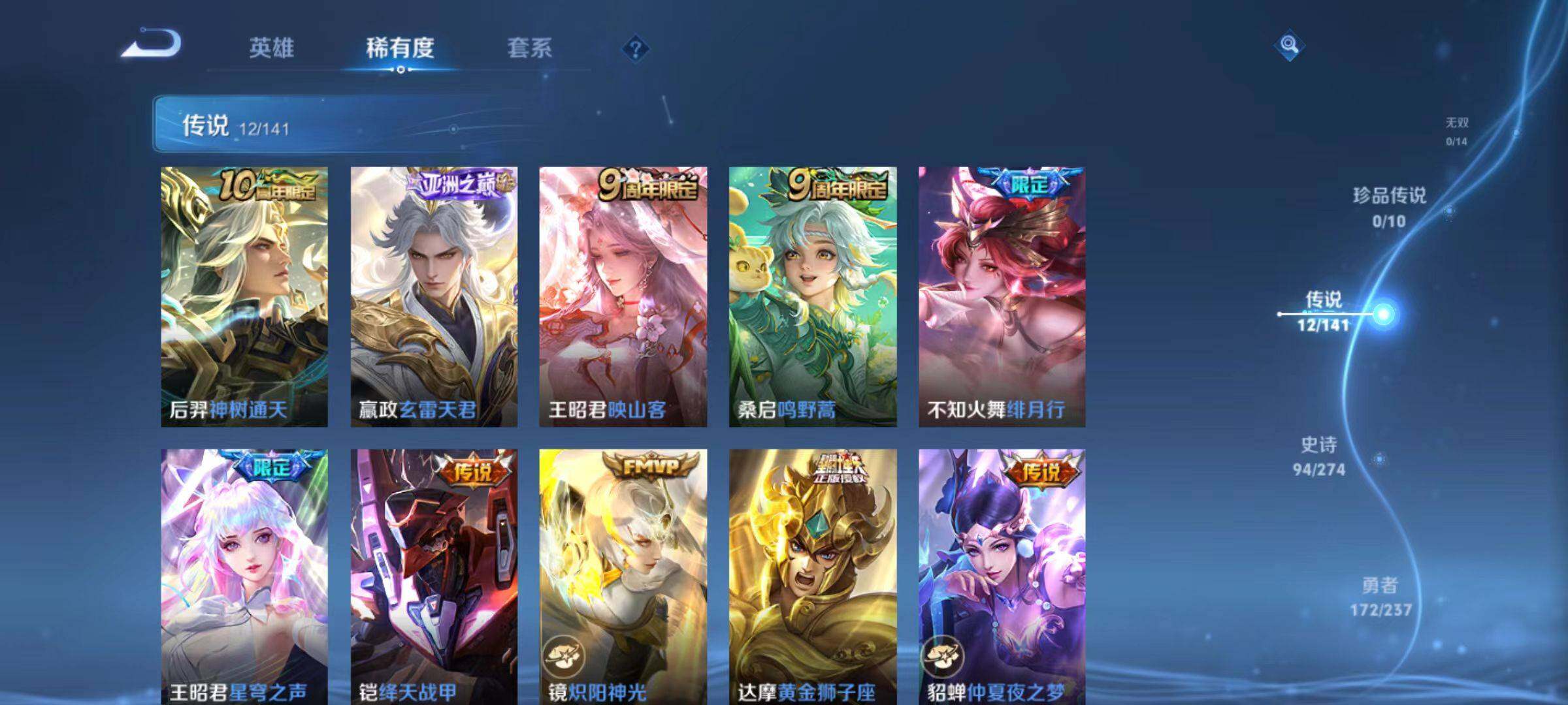 【传说皮肤】:后羿神树通天,嬴政玄雷天君,王昭君映山客,桑启鸣野蒿,不知火舞绯月行,王昭君星穹之声,铠绛天战甲,镜炽阳神光,达摩黄金狮子座,貂蝉仲夏夜之梦,宫本武藏地狱之眼,孙悟空地狱火
