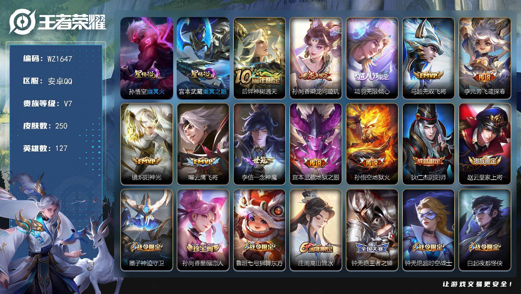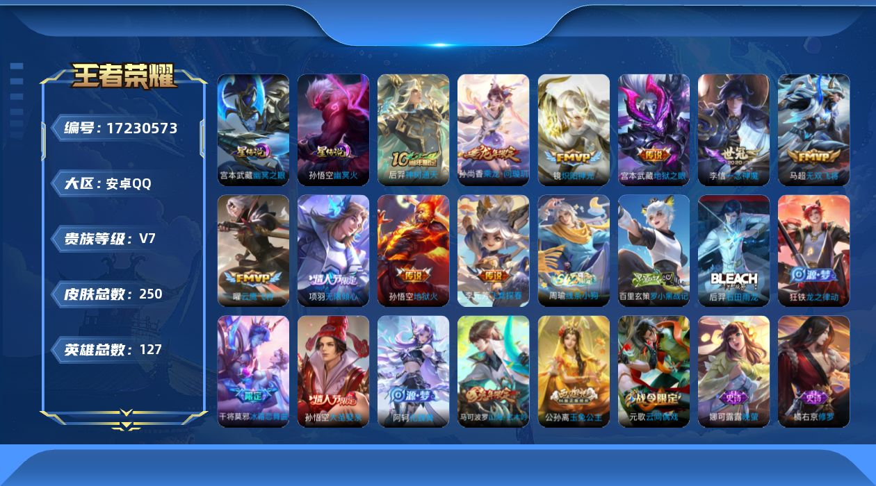 [17230573]背包多一水,安卓Q-250皮肤-10传说-71史诗 【传说皮肤】:后羿神树通天,孙尚香乘龙问璇玑,项羽无限倾心,马超无双飞将,李元芳飞鸢探春,镜炽阳神光,曜云鹰飞将,李信一念神魔,宫本武藏地狱之眼,孙悟空地狱火 【星元皮肤】:孙悟空幽冥火,宫本武藏幽冥之眼