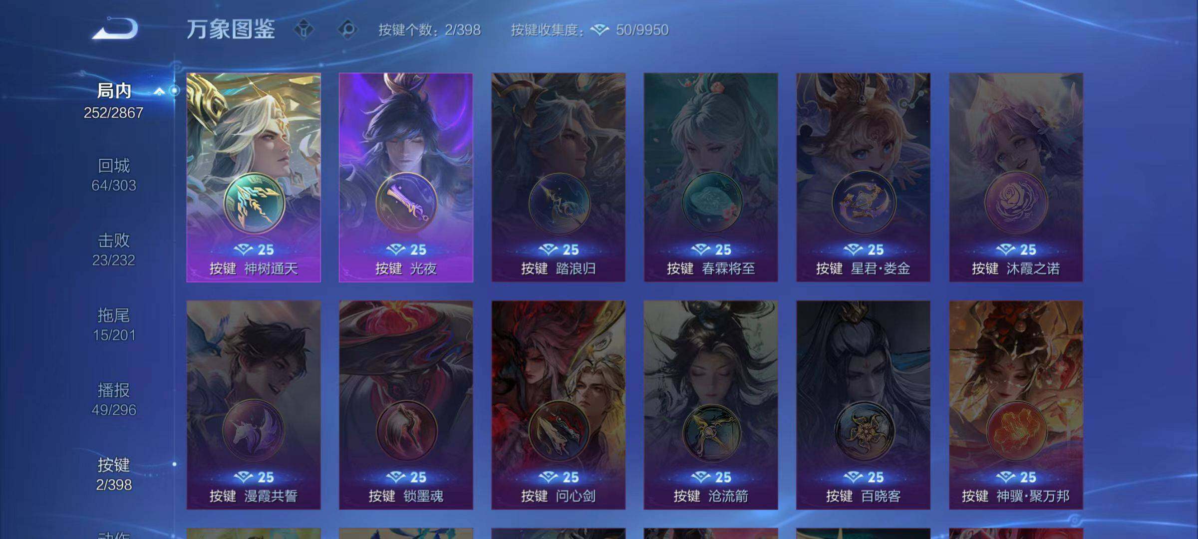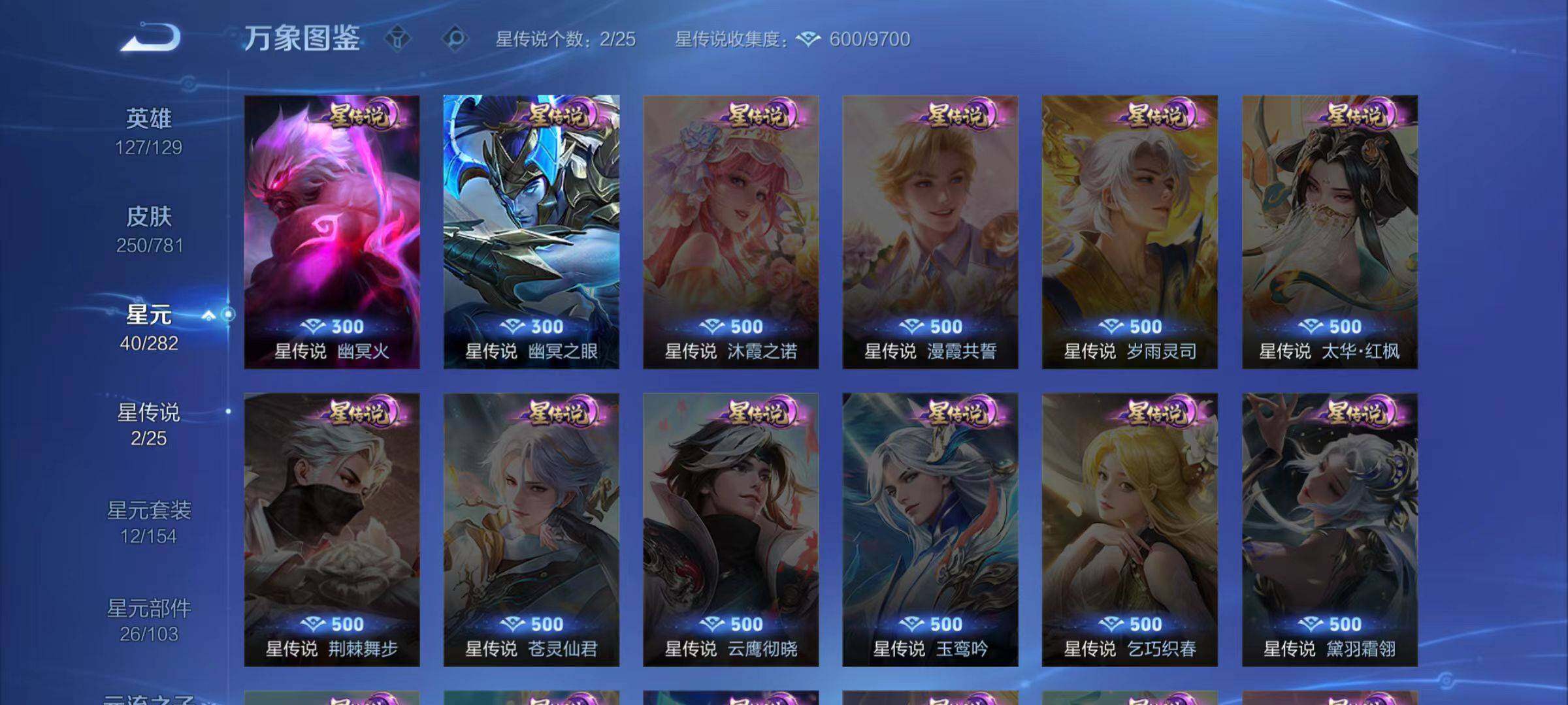 米莱狄御霄,盾山御銮,夏侯惇朔风刀,明世隐疑决卦,老夫子醍醐杖,鬼谷子原初探秘者,狄仁杰万华元夜,程咬金演武夺筹,钟馗驱傩正仪,苏烈千军破阵,钟馗神迹守卫,鲁班七号狮舞东方,蒙犽狂想玩偶喵,元歌云间偶戏,弈星混沌棋,达摩沙漠行僧,兰陵王金庭之子,沈梦溪大漠名商,李元芳云中旅人,桑启海盐诗旅,裴擒虎擒涛扼浪,鲁班大师探海日志,张良古海寻踪