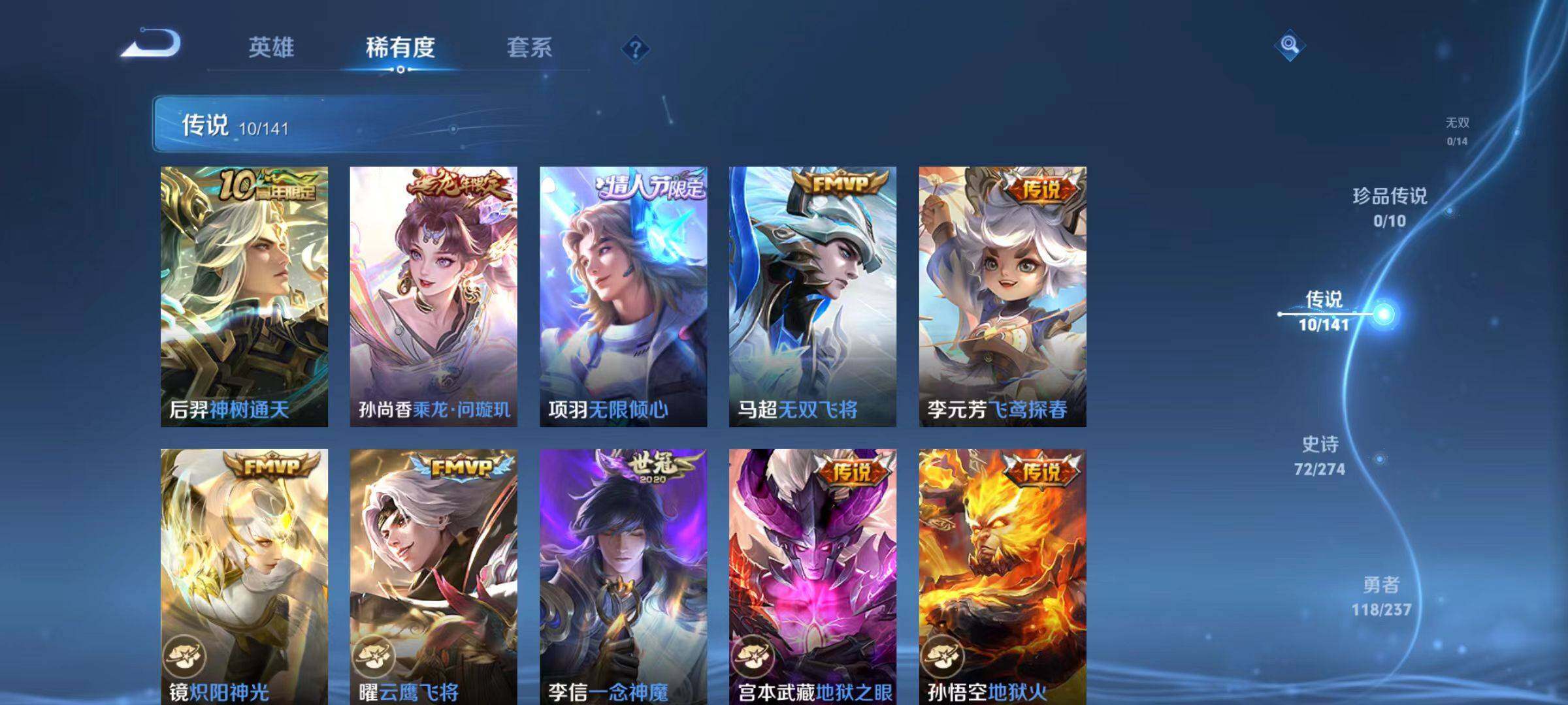 【传说皮肤】:后羿神树通天,孙尚香乘龙问璇玑,项羽无限倾心,马超无双飞将,李元芳飞鸢探春,镜炽阳神光,曜云鹰飞将,李信一念神魔,宫本武藏地狱之眼,孙悟空地狱火