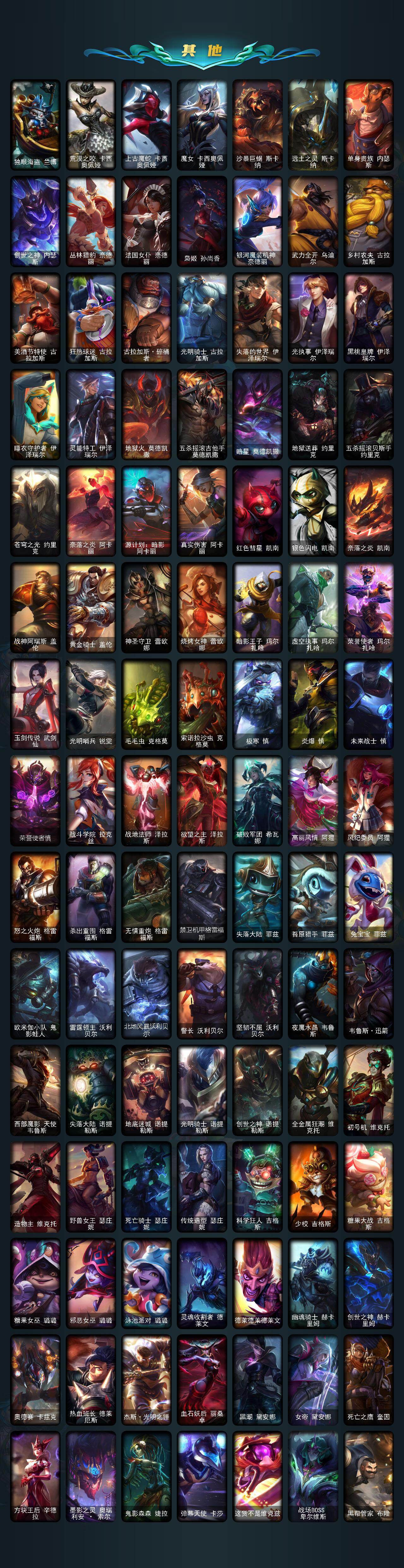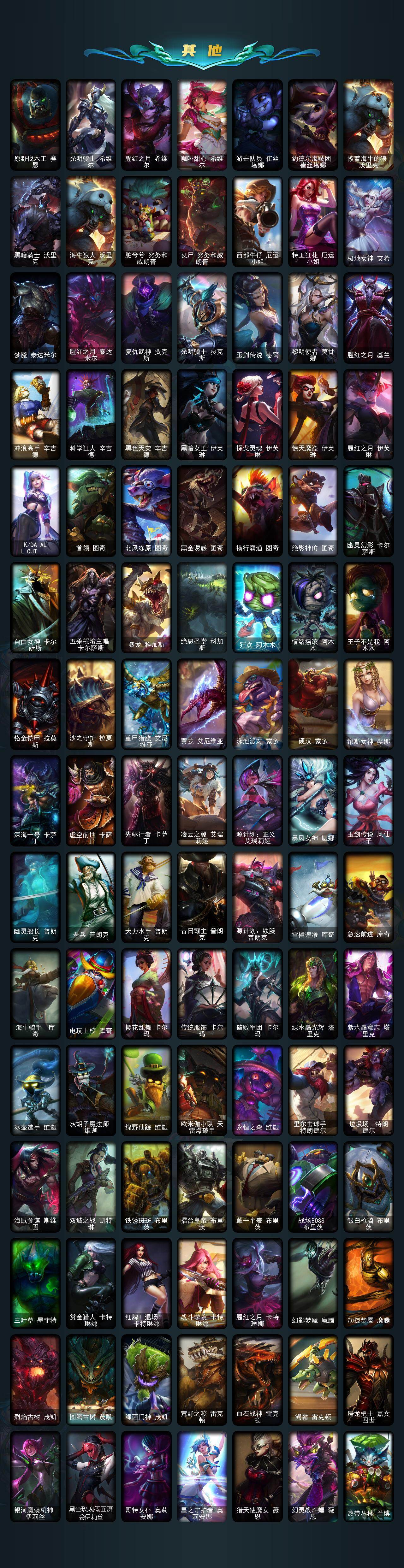 【冰雪限定】:幸福女神乐芙兰,圣诞开心鬼提莫,圣诞精灵崔丝塔娜,圣诞狂欢努努和威朗普,圣诞糖果棒厄运小姐,圣诞狂欢基兰,阿木木“主人不要我了”,平安夜女神娑娜,英勇玩具兵普朗克,邪恶圣诞老人维迦,喜庆之树茂凯,圣诞玩偶波比,圣诞老人古拉加斯,圣诞驯鹿克格莫,魄罗骑士瑟庄妮,冰雪兽纳尔,北极星使者萨科