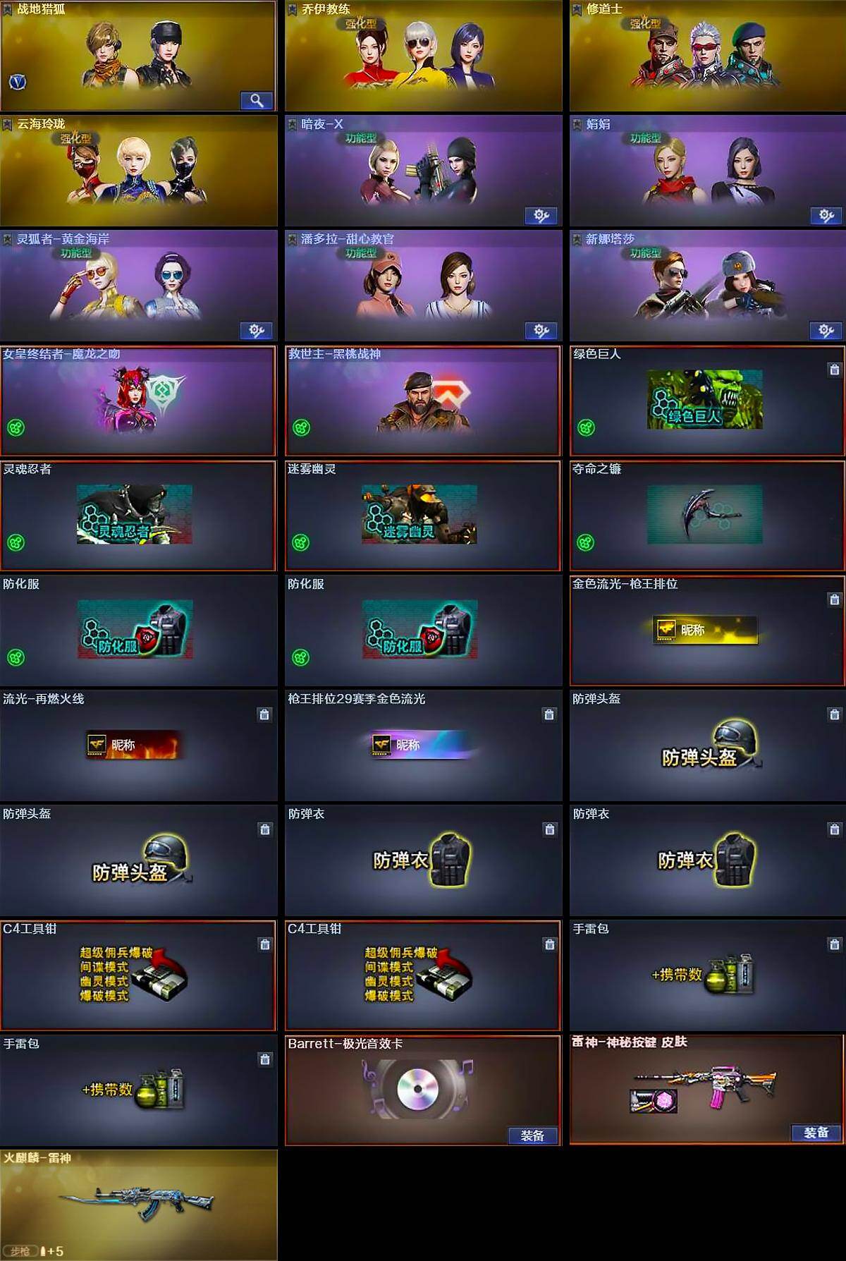 【道具】:女皇终结者-魔龙之吻,救世主-黑桃战神,绿色巨人,灵魂忍者,迷雾幽灵,夺命之镰,防化服*2,金色流光-枪王排位,流光-再燃火线,枪王排位29赛季金色流光,防弹头盔*2,防弹衣*2,C4工具钳*2,手雷包*2