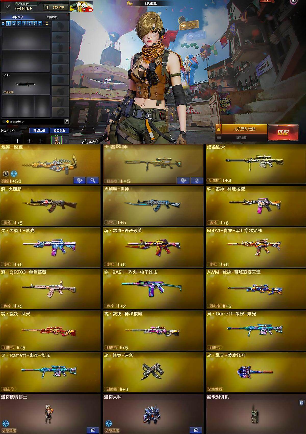 - [12944135]湖北一区-9V-0王者-0炫金 【传说武器】:传说圣谕 【热门武器】:传说圣谕,M4A1-黑骑士 【人偶武器】:火麒麟-灵狐,迷你生化手雷,生化手雷-机甲核心 【英雄级武器】:M4A1-黑骑士,Barrett-极光,沙鹰-天神,屠龙 【特殊枪械】:1黑骑士