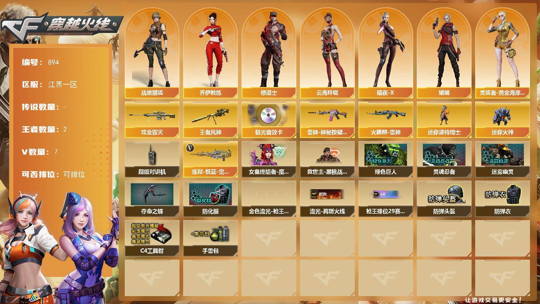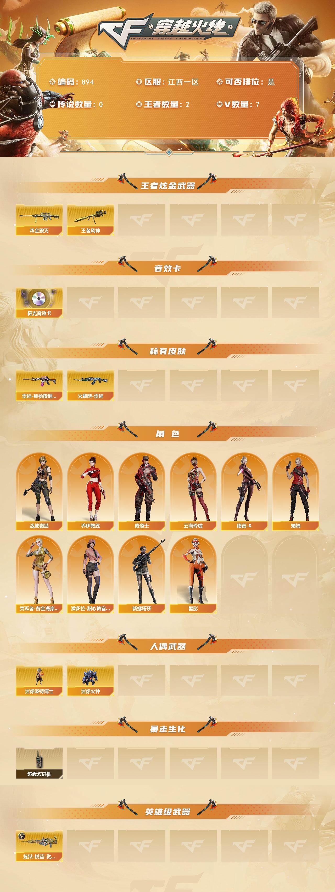 - [12297728]可二次 可修改实名 排位资格:有 2王者武器 1炫金武器 110V武器 7V角色 31皮肤 可排位 武器:G36C-幻影,柯尔特-竞技荣光,擎天-竞技荣光,AK12-天启,炼狱-百战金芒,QBZ03-金色蔷薇,AK47-B-身先士卒,AK47-B-常胜将军,黑武士-锦绣游龙,Barrett-暗月传说,烟雾弹-竞技荣光,炫金千变,COP-堕天神,M200-竞技荣光,神圣爆裂者III,无影-神兵利器,闪光弹-雷暴,闪光弹-堕天神,闪光弹-雷霆,王者星神-觉醒版,云龙扇,Barrett-毁灭,王者之锋-觉醒版,死亡之眼,王者之击-觉醒版,闪光弹-云龙,雷霆之契,王者之灵-觉醒版,M4A1-黑骑士,COP 357-云龙,雷霆之锋,M4A1-堕天神,M4A1-再燃火线,VSK-94-金蚀,麒麟刺-百战金芒,黑骑士-海王,闪光弹-竞技荣光,斯泰尔-蝴蝶,幻灵之锋,烟雾弹-雷暴,高爆手雷-竞技荣光,王者之啸-觉醒版,高爆手雷-雷霆,高爆手雷-雷暴王者,斩神刀-雷暴,白虎-电玩蓝兔,匕首-幻能朋克,高爆手雷-堕天神,烟雾弹-雷霆,烟雾弹-堕天神,死神-雪域霜狐,麒麟刺-堕天神,高爆手雷-雷暴,机械迷城-穹宇,AK-47-猩红传说,龙啸-堕天神,屠龙,M4A1-雷神,AK47-B-战士,Kar98K-星神,轻型军用手斧-再燃火线,AK47-火麒麟,高爆手雷-云龙,高爆手雷-雷霆王者,M200-幻神,M4A1-雷霆王者-觉醒版,COP 357-幻灵,麒麟刺